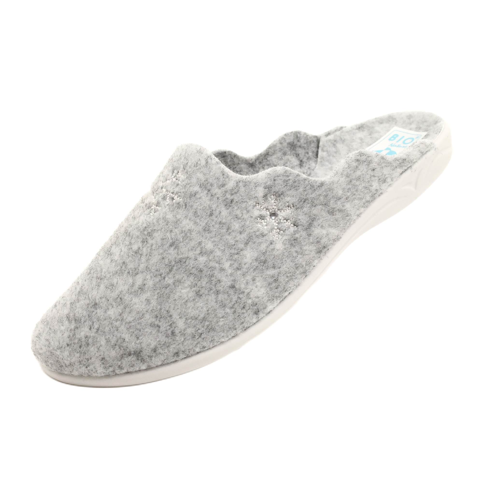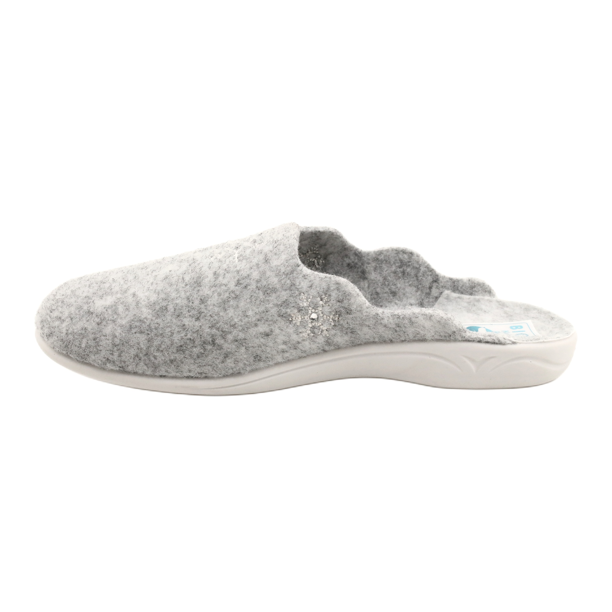 Vnitřek pantoflí, rovněž z plsti, poskytuje vynikající izolaci a PU podrážka z pěnového syntetického materiálu tlumí mikronárazy, díky čemuž je každý krok lehký a pohodlný. Šedé barvy pantoflí zapadnou do každého designu interiéru a ozdobné kamínky jim dodávají eleganci a styl.