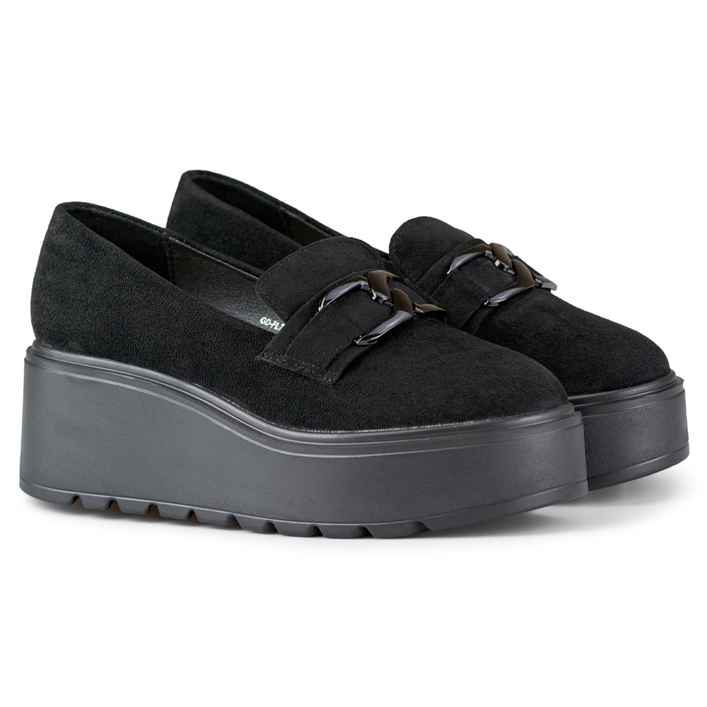 Elegantní ženské černé boty vyrobené z ekologického semiše. Model na stabilním klínu s výškou 6 cm s koženou stélkou, která poskytuje pohodlí a lepší cirkulaci vzduchu. Vložená struktura usnadňuje oblékání a zaoblený nos přidává univerzální charakter - ideální pro každodenní městské stylizace.