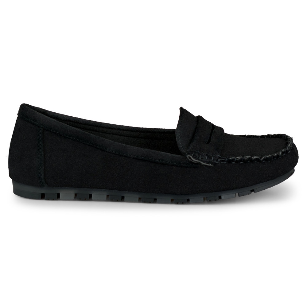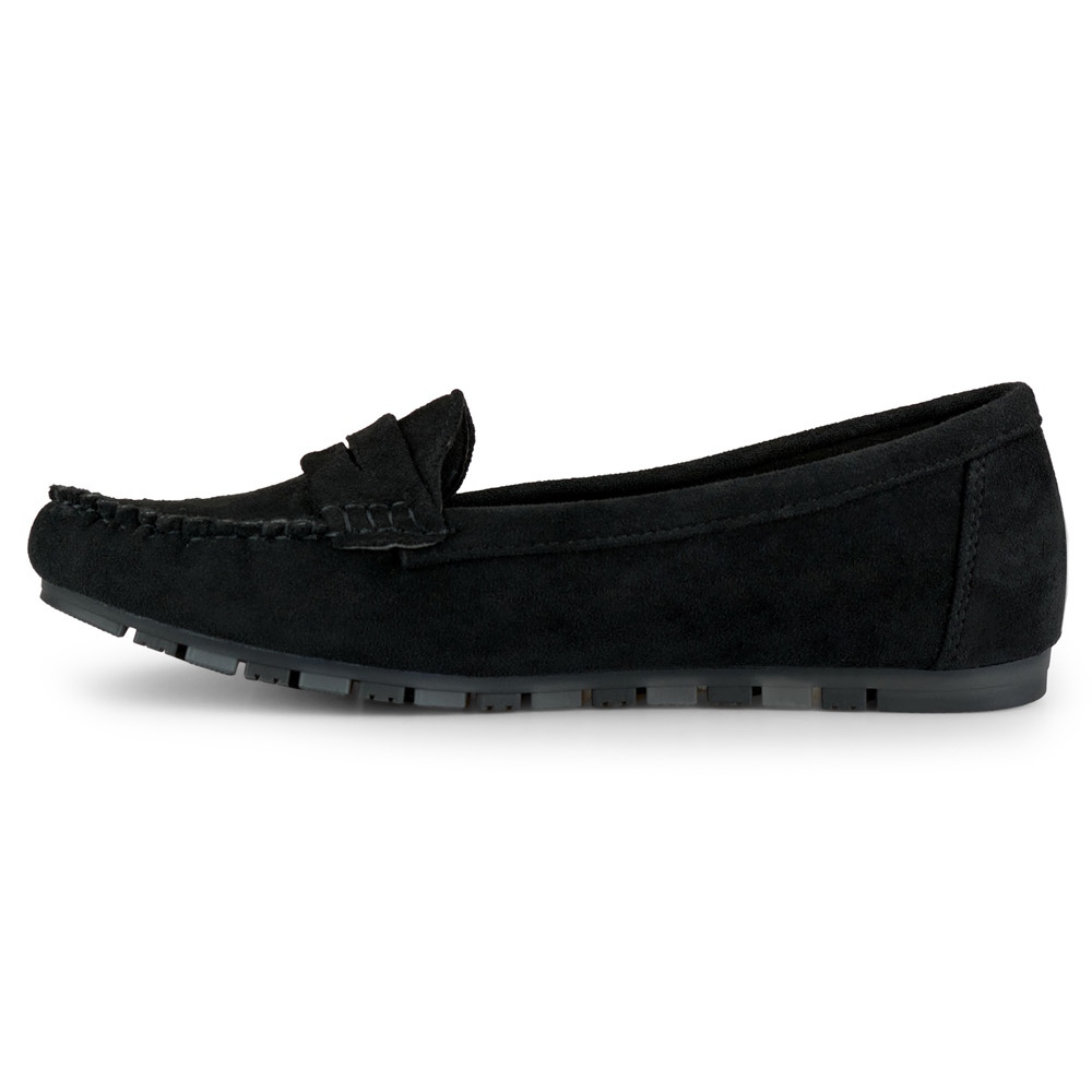 Pohodlné černé dámské mokasíny - klasika v moderním vydání. Černý ekologický semiš na horní a přírodní vložení kůže poskytuje elegantní vzhled a pohodlí nošení po celý den. Plochý, polstrovanou syntetickou podrážku a posuvný design dělají boty praktické a snadno použitelné - ideální pro jaro a léto.