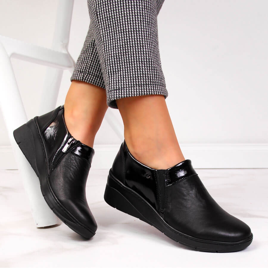 Boty jsou navrženy v ženském střihu, který dokonale zvýrazní postavu, a díky klasické černé barvě se hodí k mnoha stylům, ať už každodenním nebo formálnějším. Vysoký klín 5 cm zajišťuje atraktivní vzhled a zároveň komfort nošení.