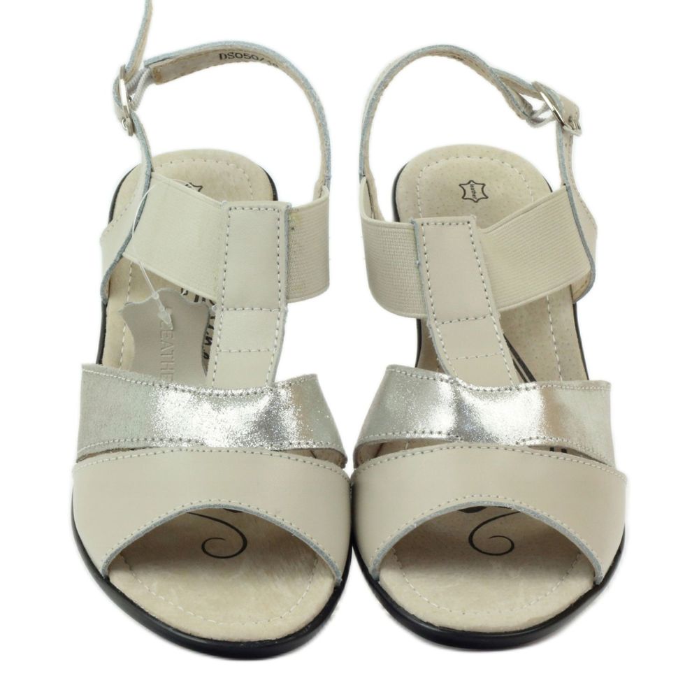 Sandály jsou vyrobeny z přírodní kůže v odstínech béžové a stříbrné, což jim dodává jedinečný charakter. Zapínají se na praktický suchý zip, zaručují snadné nazouvání a správné přizpůsobení noze. Nasazené na jemném, čtyřcentimetrovém klínku poskytují stabilitu a elegantní vzhled, pozornost upoutá individuálně šitý a střižený svršek.