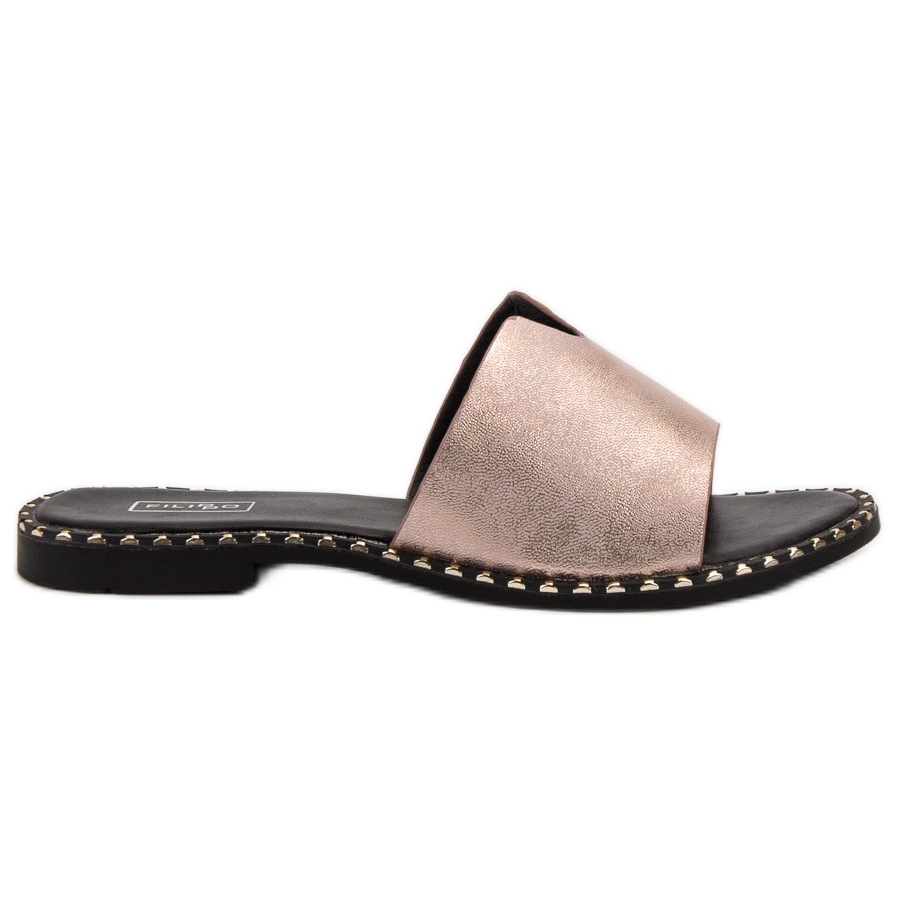Pohodlné lesklé žabky Filippo ve žlutém zlatě jsou perfektní volbou pro ženy, které chtějí spojit styl s pohodlím. Tyto elegantní žabky vyrobené z ekologické kůže potěší saténovým lesklým povrchem. Ozdobný výřez na přední straně a ozdobné stříbrné trysky na podrážce jim dodávají jedinečný charakter, díky čemuž jsou dokonalým doplňkem jakéhokoli letního stylingu.