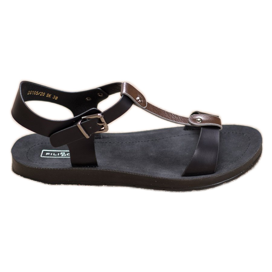 Objevte pohodlí a styl se sandály Filippo v elegantní kombinaci černé a šedé. Tyto dámské sandály vyrobené z ekologické kůže kombinují klasický design s moderními, poutavými detaily. Otevřená špička a pata poskytují volnost a subtilní pásek na prstech zajišťuje správnou podporu nohou.