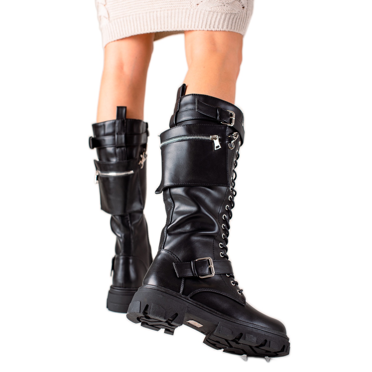 Díky zipu a šněrování se nazouvání a zouvání bot stává rychlou a příjemnou činností. Kozačky jsou dostupné v šířce stopky 34 cm a jsou vysoké do půl lýtek, což se hodí k různým stylům oblečení.