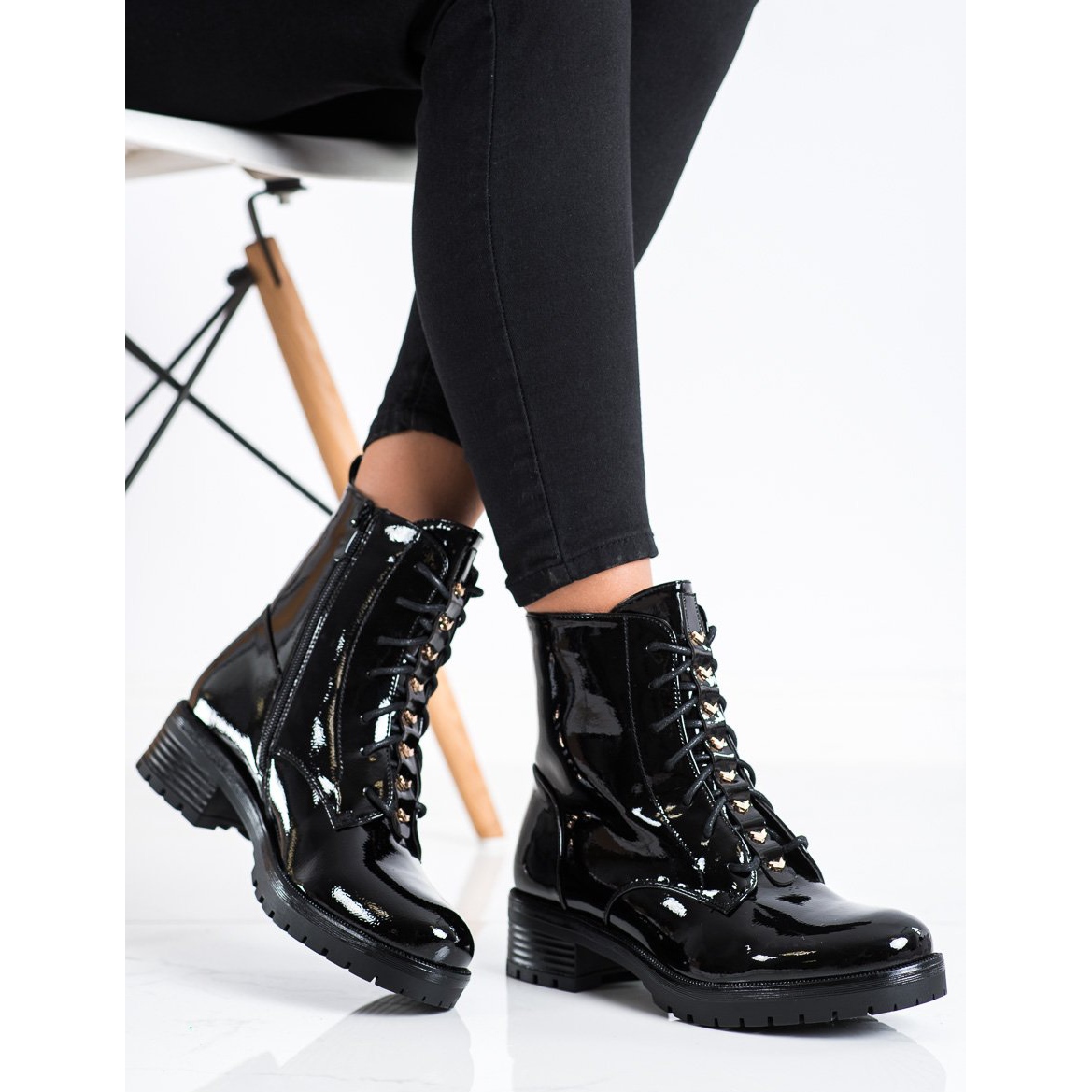 Pracovníky S. BARSKI vyrobené z lakované eko kůže jsou perfektní volbou pro ženy, které si cení stylu a pohodlí. Tyto černé kotníkové boty kombinují ležérní, rockový a módní styl, díky čemuž jsou ideální pro každodenní nošení i různé příležitosti.