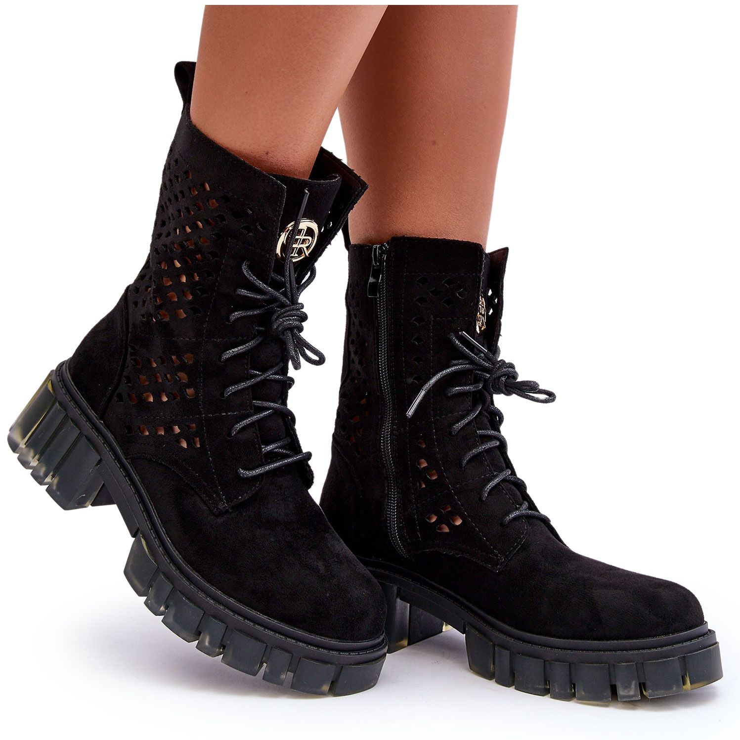 Elegantní a zároveň surové v botách o otevření formy v černé ekologické části je ideálním návrhem pro ženy, které si cení módy a pohodlí. Horní zdobená jemným vzorem otevřené práce, připevněná praktickým zámkem a navíc přichycena pro lepší přizpůsobení. Ztužená pata a dekorace na jazyku zdůrazňují charakter boty a masivní post 5,5 cm vysoká s platformou 3 cm zajišťuje stabilitu a izolaci z chladné půdy.