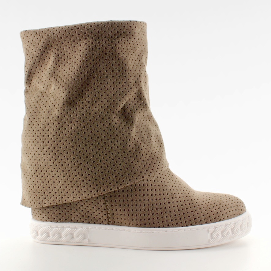 Stylové boty na skrytém klínu. Jsou vyrobeny ze semišového, prolamovaného materiálu. Mají měkký svinovací svršek a skrytou patu vysoké 8 cm. Boty jsou velmi pohodlné, vypadají velmi elegantně na noze.