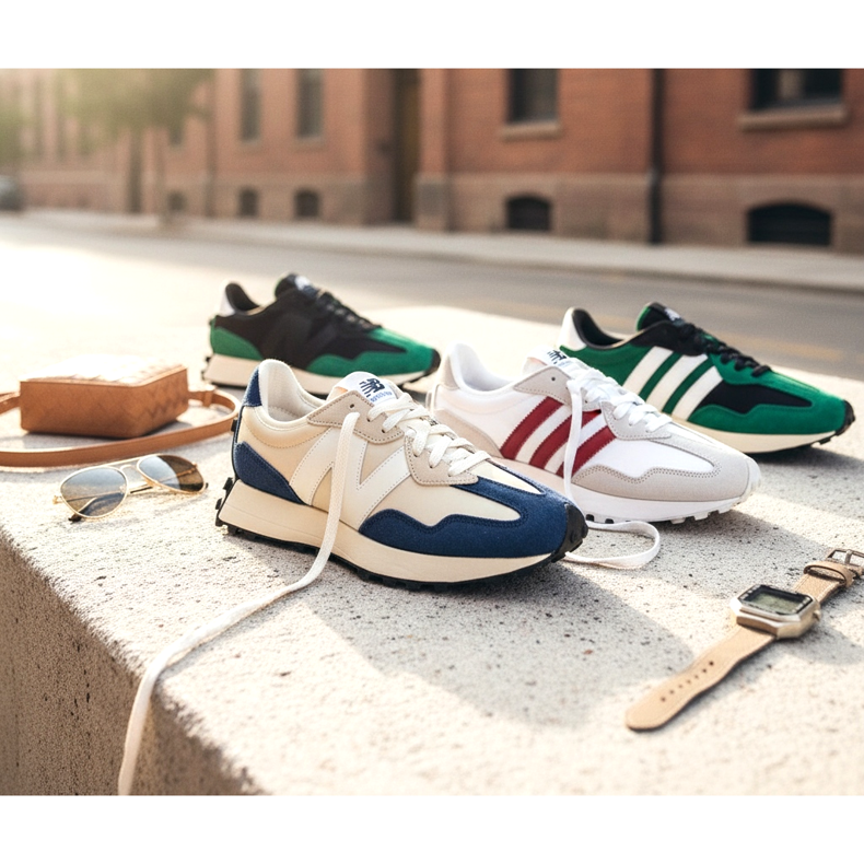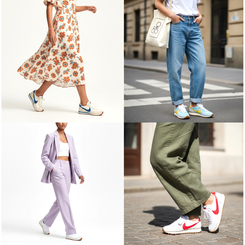 Na midi šaty: Lehké midi šaty z látky s květinami nebo geometrickými vzory v kombinaci s krémovými retro běžeckými botami jsou jedním z nejoblíbenějších looků sezóny. Tento kontrast mezi ženskostí šatů a sportovním charakterem boty vytváří výjimečně dynamický a svěží styling.