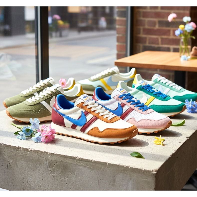 Nike Cortez je další ikonou – botou vytvořenou pro olympijské hry v Mnichově v roce 1972, s výraznou štíhlou siluetou a barevným patchworkovým svrškem. V roce 2026 ji Nike vydá v nových, pastelových verzích, které se perfektně hodí k jarní náladě.