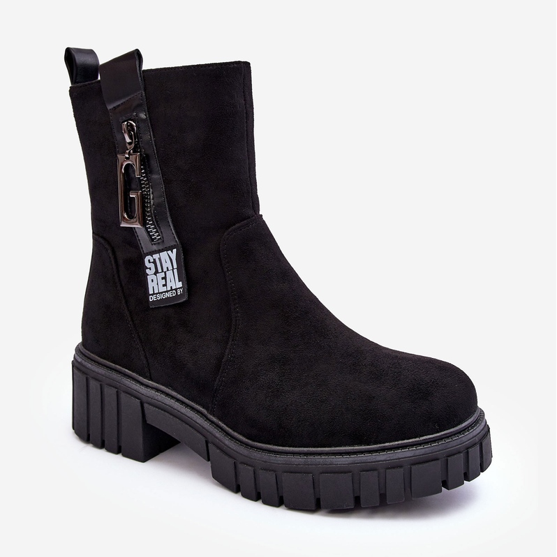 Stylové, černé boty vyrobené z ekologického semiše, které kombinují módní masivní vzhled s pohodlím nošení. Nasazeno na pevnou plošinu a ploché podpatky, izolované přikrývkou obuvi - ideální pro chladnější podzimní a zimní dny. Připevněný praktickým zámkem na vnitřní straně horního svršku, se zaobleným nosem pro pohodlí. Klasický, jednotný design bude fungovat v mnoha každodenních a příležitostných stylizacích.
