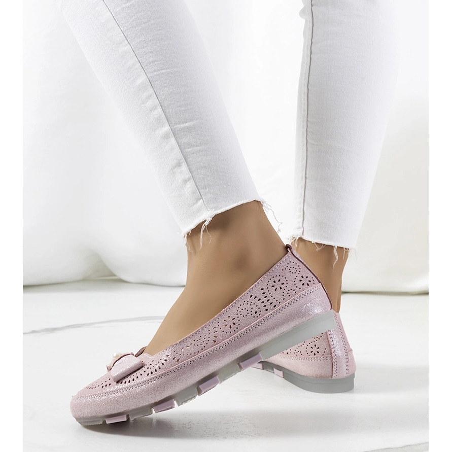 Elegantní katania mokasína vyrobená z vysoce kvalitní přírodní semišové kůže v ženském růžovém odstínu. Horní horní část byla zdobena jemným vzorem otevřených prací a lesklými částicemi a dekorativní luk dodává celé kouzlo. Měkká, profilovaná přírodní kožená vložka poskytuje pohodlí i při dlouhém opotřebení. Šedá gumová podešev zaručuje dobrou adhezi a lehkost. Model s nízkým střihem je ideální pro teplé dny - letní kolekce.