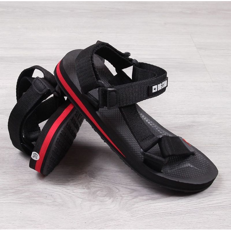 Big Star Int1173a sandály - černé, sport a pohodlné na léto. Lehký, textilní svršek se stylovým vzorem s logem výrobce a nastavitelným upevňovacím suchým zipem zajišťuje nějaké fit a rychlé nasazení. Vložka z měkké pěny a plochá podrážka (přibližně 2 cm) zaručují denní pohodlí během procházek po městě, výlety a aktivity v letním životním stylu.