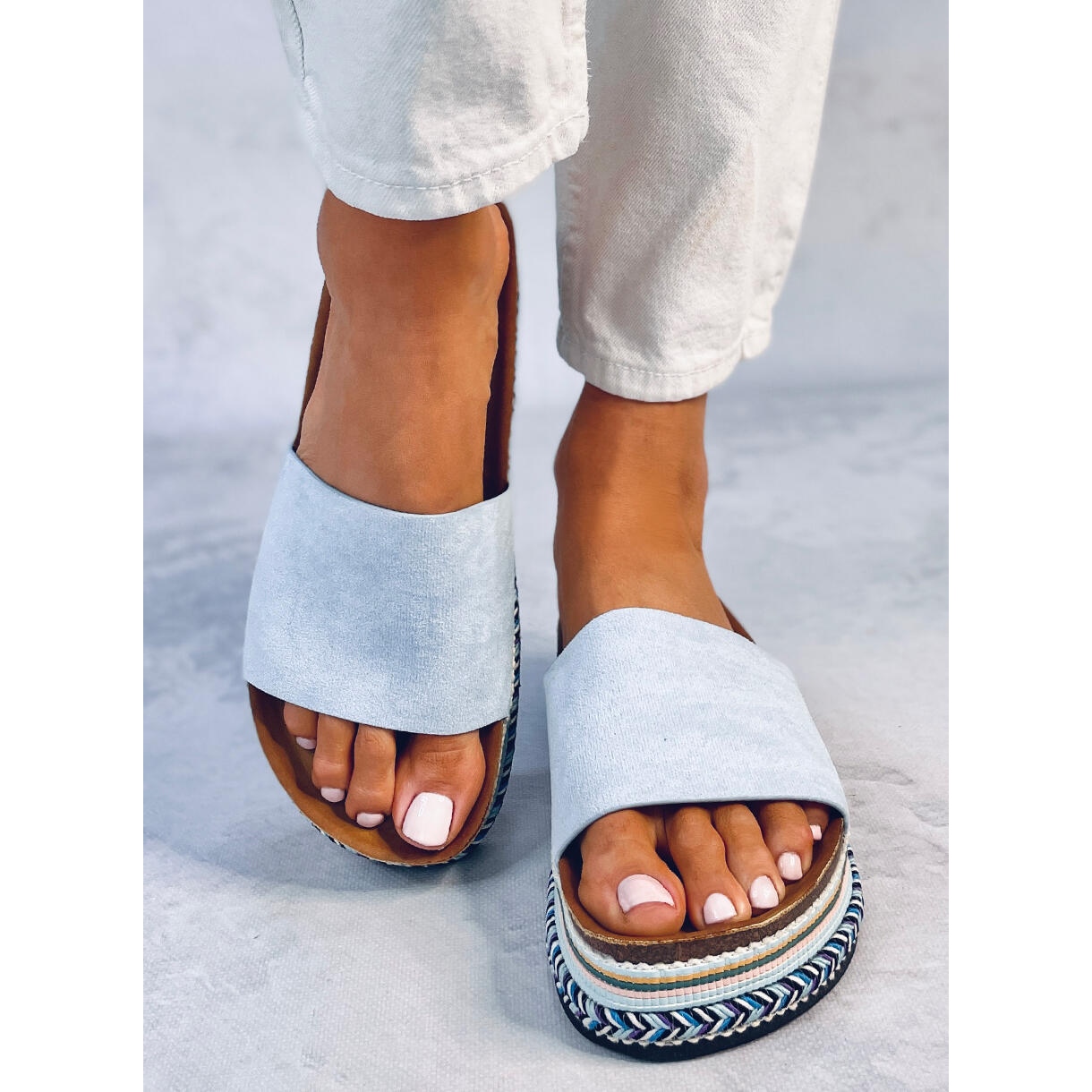 Žabky Demou Blue se zdobenou podrážkou snadno začleníte do ležérního (každodenního) outfitu a dodají špetku jedinečného stylu. Hladký povrch žabek v krásné modré barvě se skvěle hodí k letním šatům, kalhotám i sukni.
