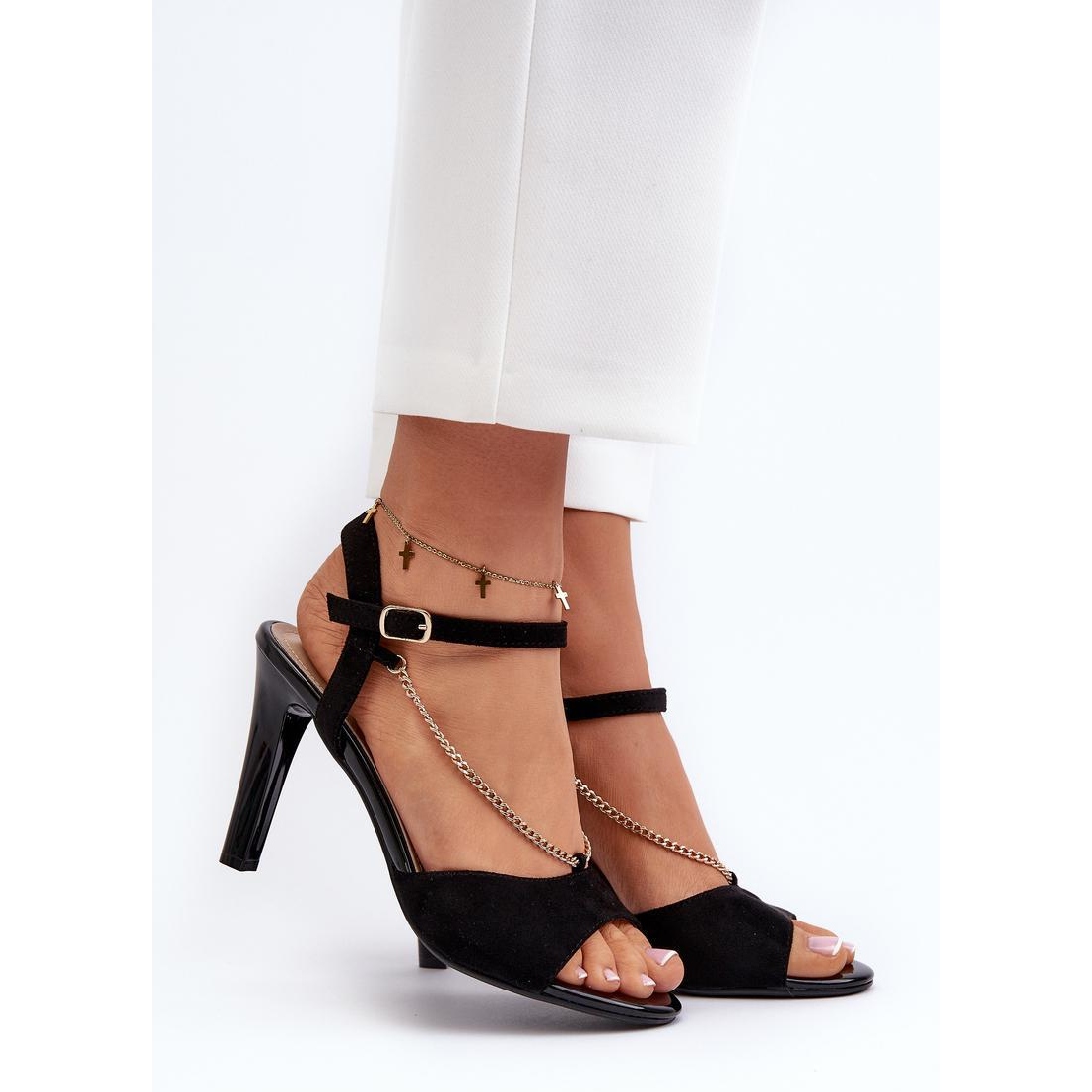 Tyto sandály se potěší nejen estetikou, ale také funkčností. Díky nastavitelnému pásu s přezkou je můžete snadno spojit s nohou, což zajišťuje pohodlí i při dlouhém opotřebení. Vysoká pata ve formě špendlíku, vysoká 9,5 cm, přidává eleganci a zdůrazňuje postavu a jemný dekorativní řetězec jim dává jedinečný charakter.