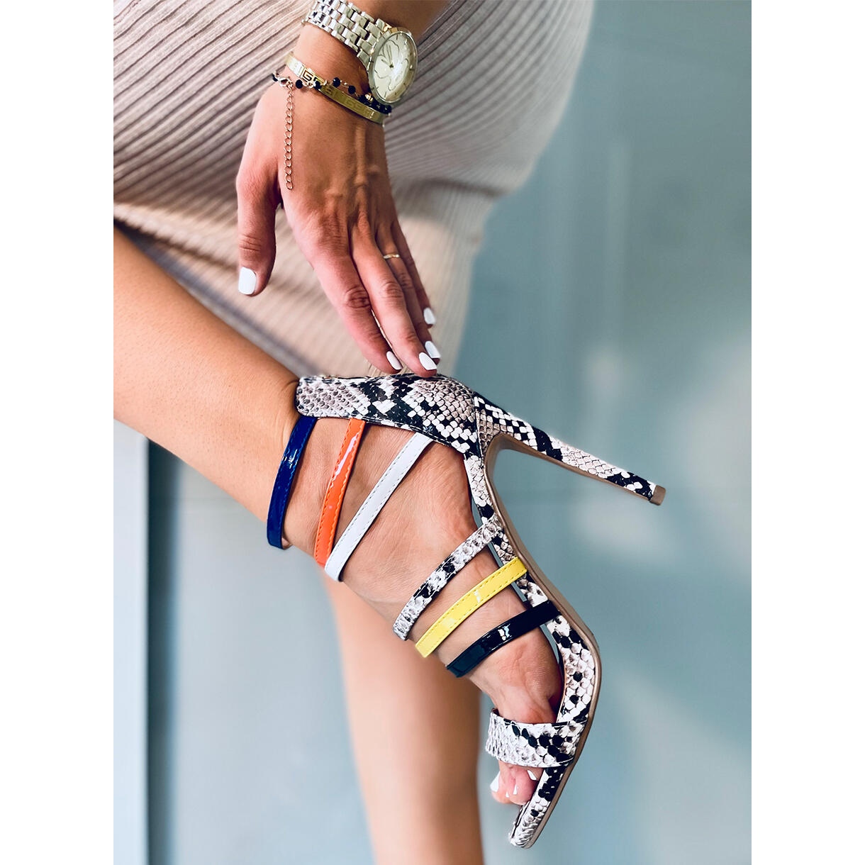 Sandály se vyznačují motivem hadí kůže, který dodává trochu divokosti a charakteru, dokonale ladící s aktuálními módními trendy. Úzký 11 cm vysoký jehlový podpatek opticky prodlužuje nohy a činí jakýkoli styling elegantnějším. Zip vzadu je praktickým detailem, který usnadňuje obouvání a vyzouvání.