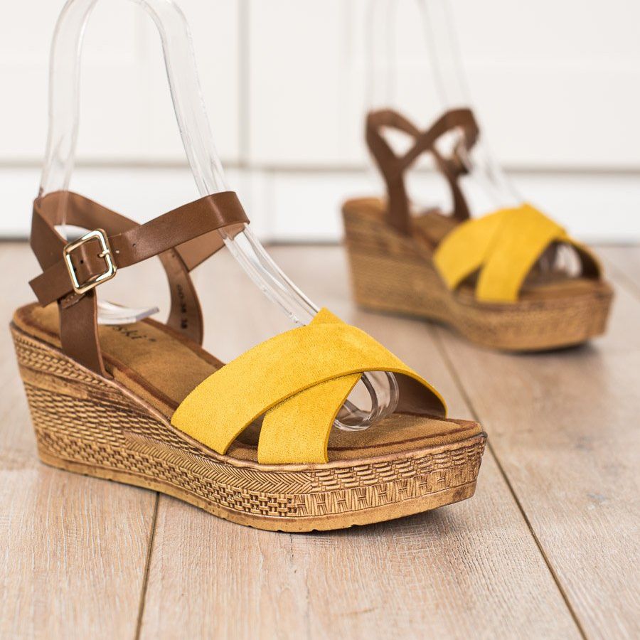 S. BARSKI Sandály na klínku S.BARSKI v hnědé a žluté barvě jsou perfektní volbou pro ženy, které oceňují styl a pohodlí. Tyto elegantní sandály vyrobené z vysoce kvalitní imitace kůže a ekologického semiše jsou dokonalou kombinací moderny a klasického designu. Pásky sandálů v odstínech hnědé a žluté jim dodávají charakter a zapínání na přezku na boku zajišťuje snadné nazouvání a dokonalé padnutí na nohu.