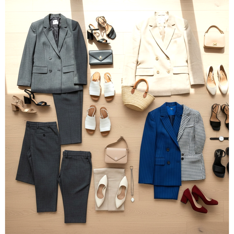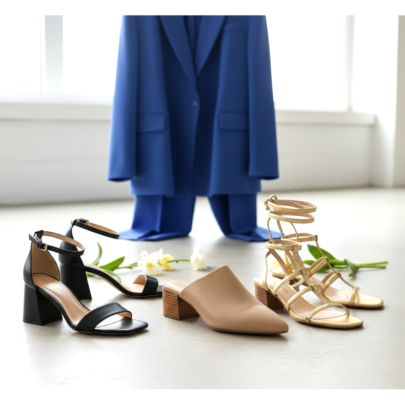 Dámské obleky jsou v mnoha verzích – na míru, oversized, jednobarevné nebo vzorované. Každá vyžaduje trochu jiný přístup k výběru sandálů.
