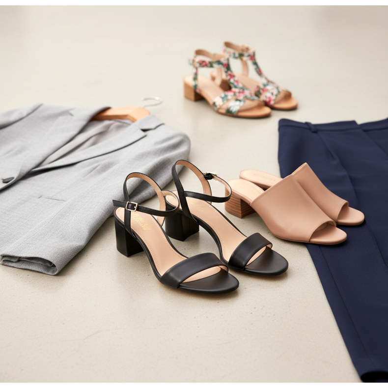 V kancelářích s formálním dress codem zvolte sandály na vysokém podpatku nebo mule v tlumené barvě. Vyhněte se stylům s příliš mnoha pruhy, otevřenými špičkami nebo tropickými vzory. Kožené sandály na podpatku 6-8 cm v černé nebo nude jsou v takovém prostředí tou nejlepší volbou.