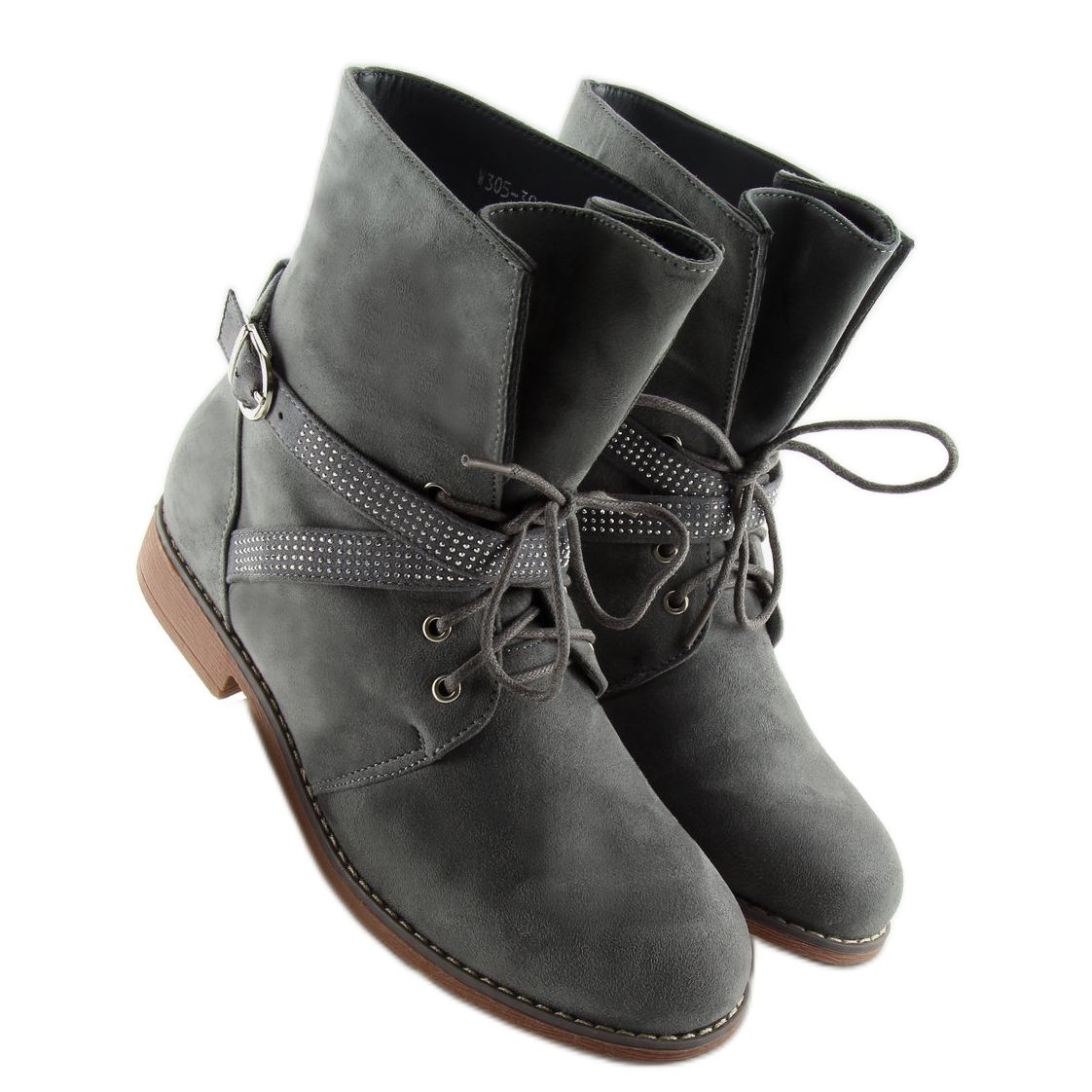 Šedé dámské kotníkové boty W305 šedé jsou ideální volbou pro ženy, které ocení styl a pohodlí v jednom. Tyto elegantní kozačky na plochém podpatku vynikají originálním střihem svršku, decentně zdobeným páskem s drobnými zirkony, který jim dodává jedinečný charakter.