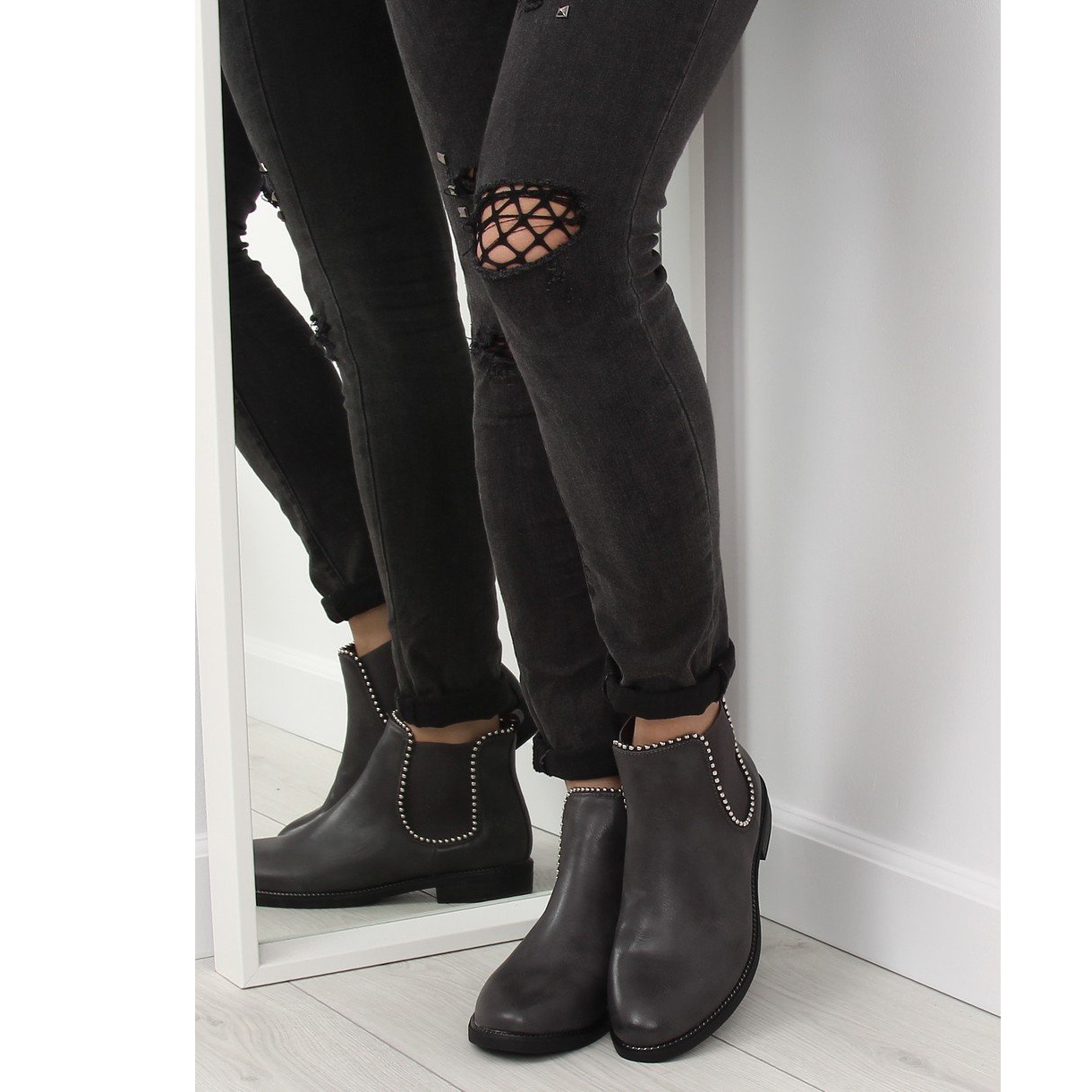 Objevte novou dimenzi stylu s dámskými šedými Chelsea boots 1003-PA Grey! Tyto elegantní ploché kozačky jsou perfektní volbou pro ženy, které oceňují módu a pohodlí. Jejich minimalistický design byl obohacen o působivou aplikaci v podobě stříbrných kuliček, které jim dodávají rockový charakter a originalitu.