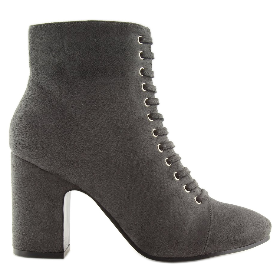 SP03 Šedé kotníkové boty na stabilním podpatku jsou perfektní volbou pro každou ženu, která si cení elegance a pohodlí při nošení. Tyto stylové kozačky s podpatkem o výšce 9 cm kombinují klasický design s moderními akcenty. Vpředu je decentní šněrování, které dodává ženský charakter a zároveň zajišťuje dokonalé přizpůsobení noze.