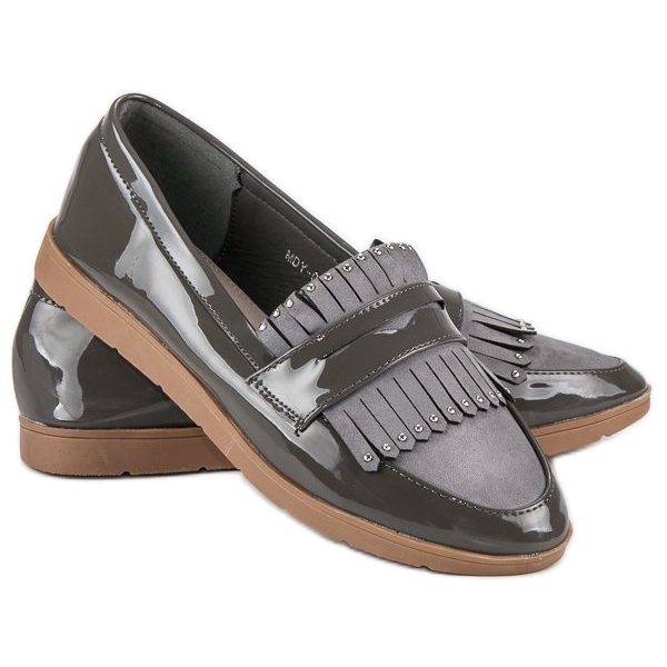 Objevte eleganci na každém kroku s šedými lakovanými mokasíny, které kombinují klasiku s moderním stylem. Tyto jedinečné dámské boty se vyznačují plnou špičkou a sofistikovanou kombinací odstínů šedé a stříbrné, což z nich dělá ideální volbu pro různé příležitosti - od formálních schůzek až po neformální výlety.