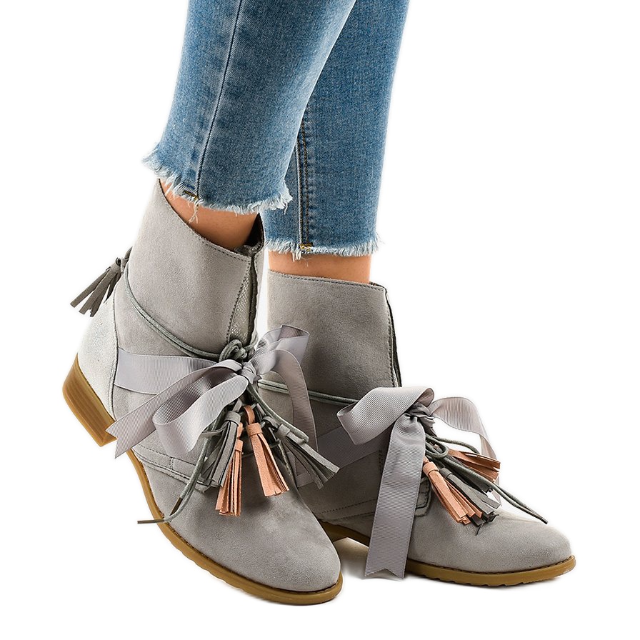 Objevte jedinečný styl s šedými plochými kotníčkovými botami s třásněmi A-226. Tyto elegantní dámské kotníkové boty vyrobené z materiálu připomínajícího semiš spojují moderní design a komfort nošení. Zajímavé zdobení v podobě barevných třásní a stuh z nich dělá perfektní doplněk každého stylingu a dodává mu jedinečný charakter.