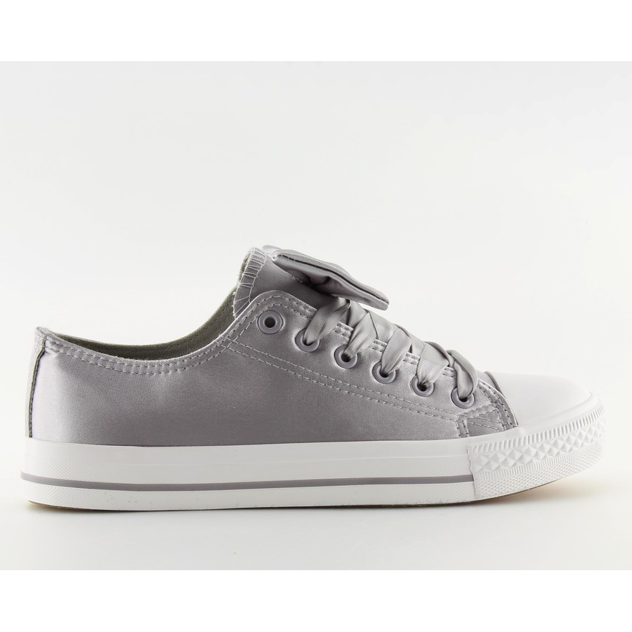 Dámské šedé saténové tenisky 16-509 Grey jsou mimořádnou obuví, která kombinuje klasiku a originalitu. Tyto tenisky vyrobené z jemného saténového materiálu vynikají nejen svým elegantním vzhledem, ale také pohodlím při nošení. Místo tradičních tkaniček je použita stuha, která jim dodává jedinečný charakter. Okouzlující mašlička, kterou lze snadno odepnout, umožňuje přeměnit boty na klasické tenisky a sladit je s různými styly.