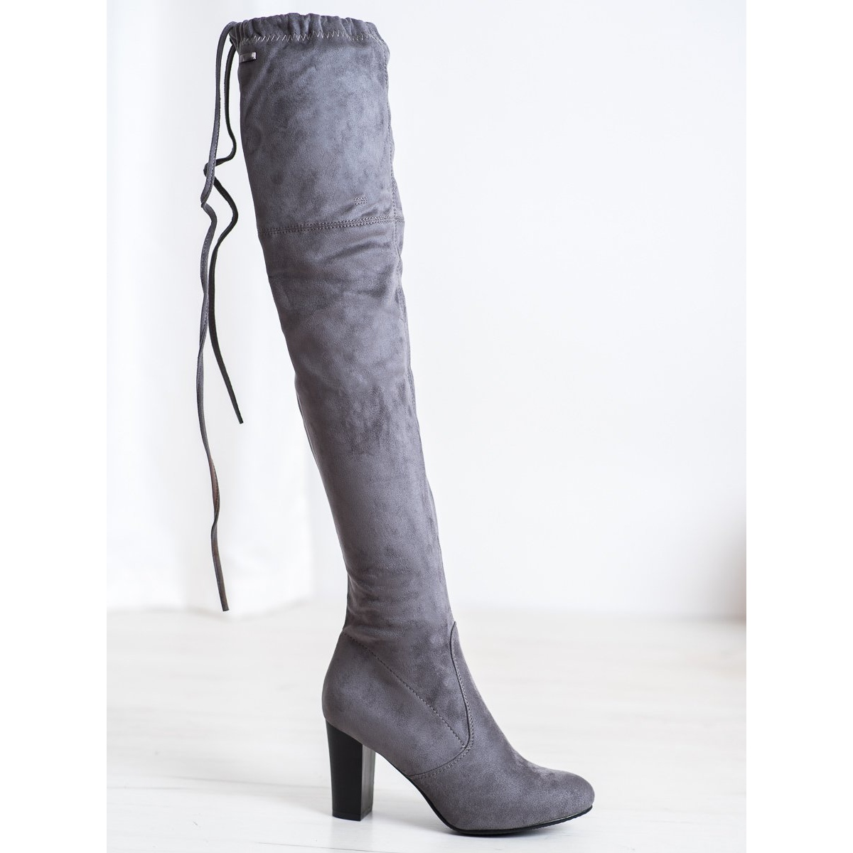 Šedé semišové kozačky SHELOVET jsou perfektní volbou pro každou ženu, která chce spojit pohodlí s elegancí. Tyto klasické kozačky nad kolena potěší nejen svým moderním vzhledem, ale také pečlivým zpracováním z kvalitních materiálů. Vnější část obuvi je imitace semiše, která jim dodává jedinečný charakter a vnitřní stélka z ekologické kůže zajišťuje komfort nošení.