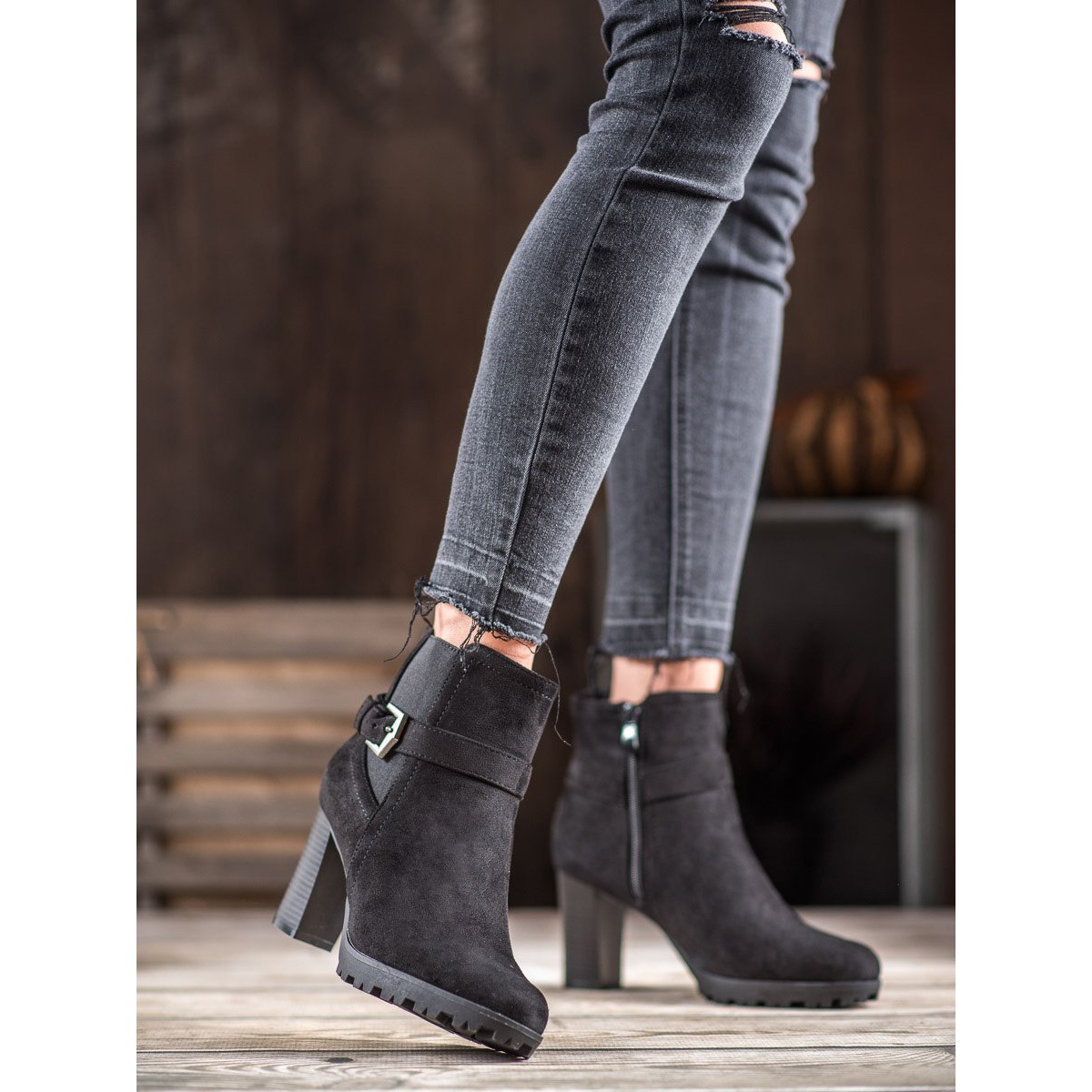 Semišové boty na platformě SHELOVET v klasické černé barvě jsou perfektní volbou pro každou ženu, která si cení stylu a pohodlí. Tyto elegantní kotníkové boty s 8 cm vysokým blokovým podpatkem jsou ideální pro každodenní styling i pro formálnější příležitosti. Díky 2 cm vysoké platformě je chůze v nich ještě příjemnější.
