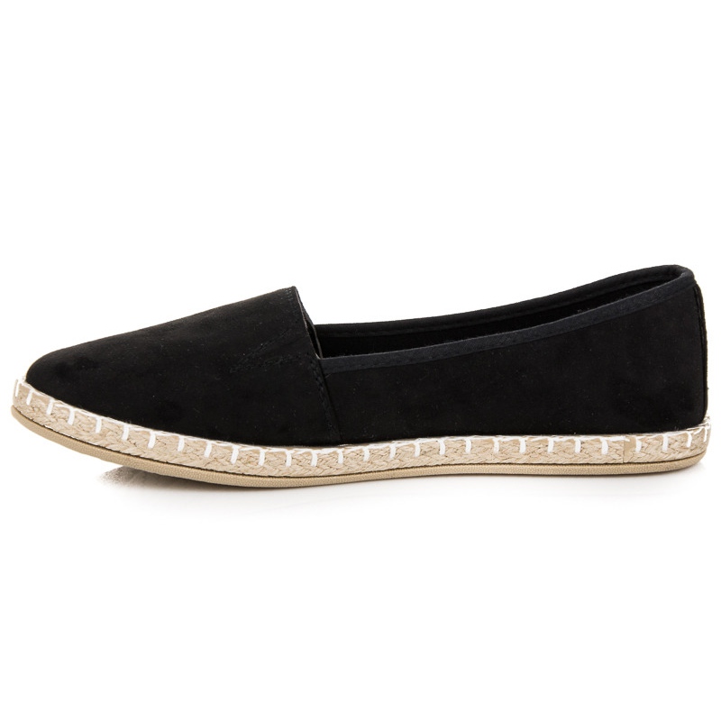 Espadrilky mají nazouvací uzávěr, díky kterému je jejich oblékání extrémně snadné a pohodlné. Díky kulaté špičce se nohy cítí pohodlně a výška podpatku 2 cm dodává lehkost a jemnost. Absence vzoru v kombinaci se sytě černou barvou dělá tyto boty dokonale vhodné k nejrůznějším outfitům – od letních šatů až po ležérní džíny.
