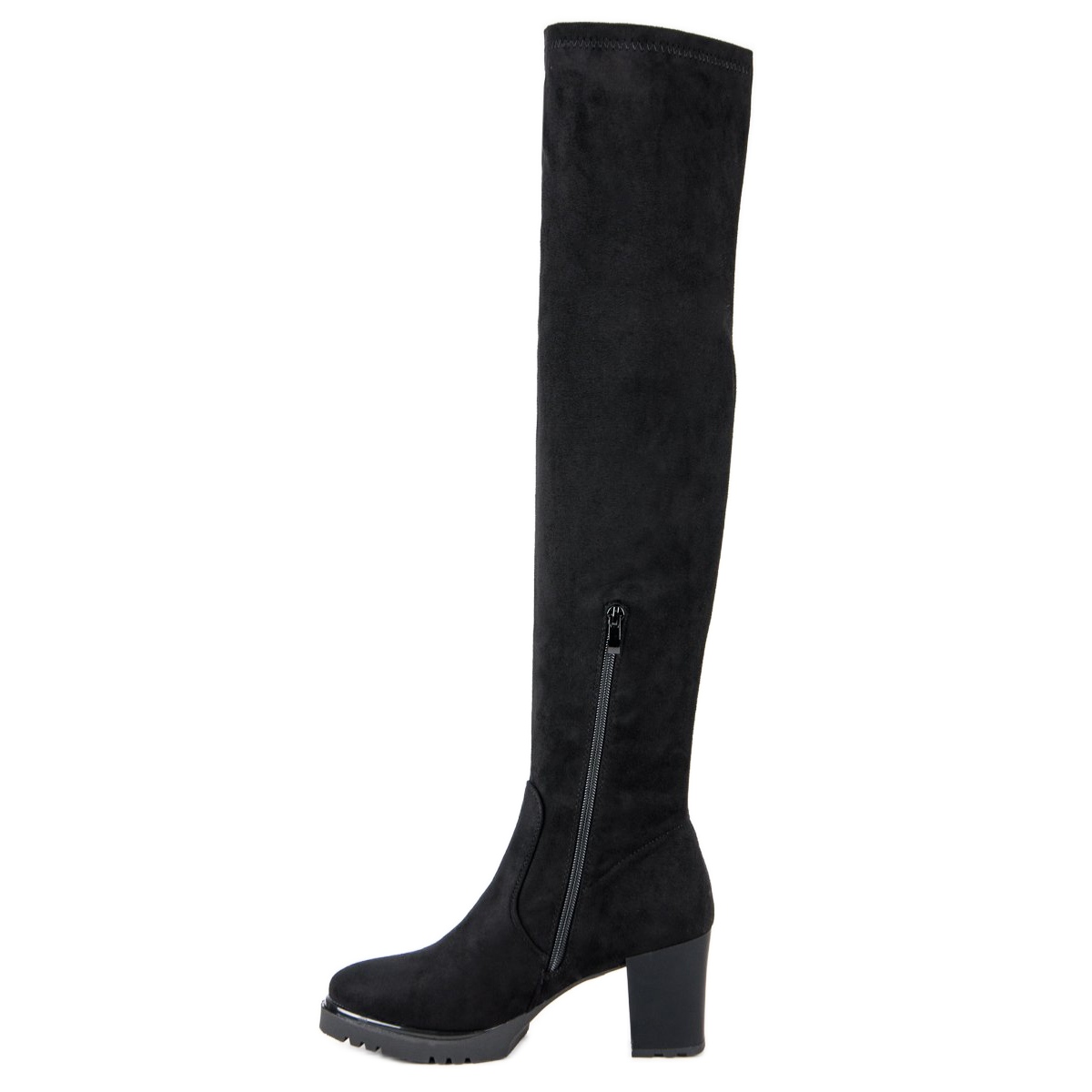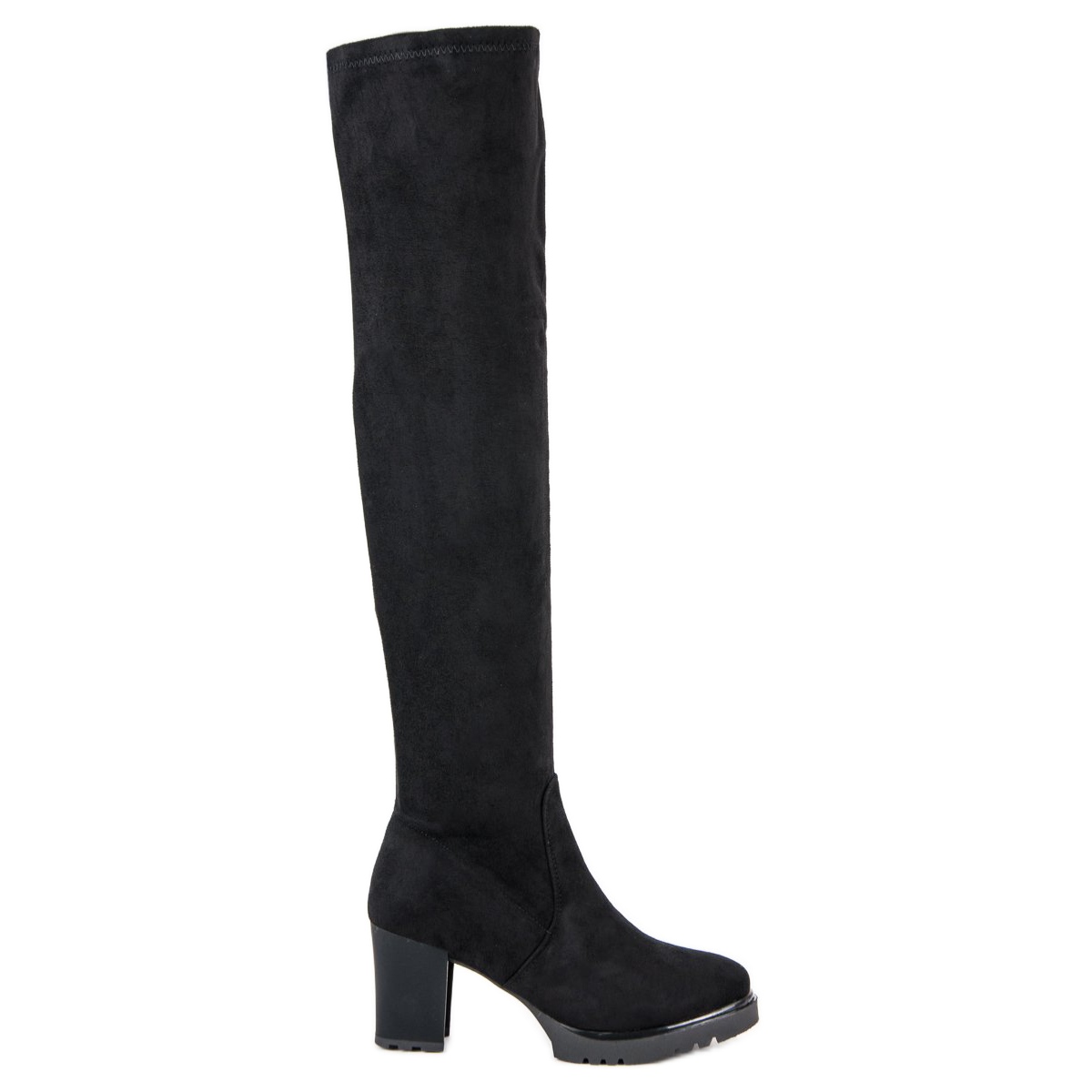 Semišové boty na platformě v černé barvě jsou perfektní volbou pro podzimní a zimní dny. Vyrobeny z ekologické semišové kůže, spojují eleganci a pohodlí při používání. Klasický střih s vysokým svrškem ke kolenům krásně vypadá na noze a zároveň poskytuje dostatečné teplo.