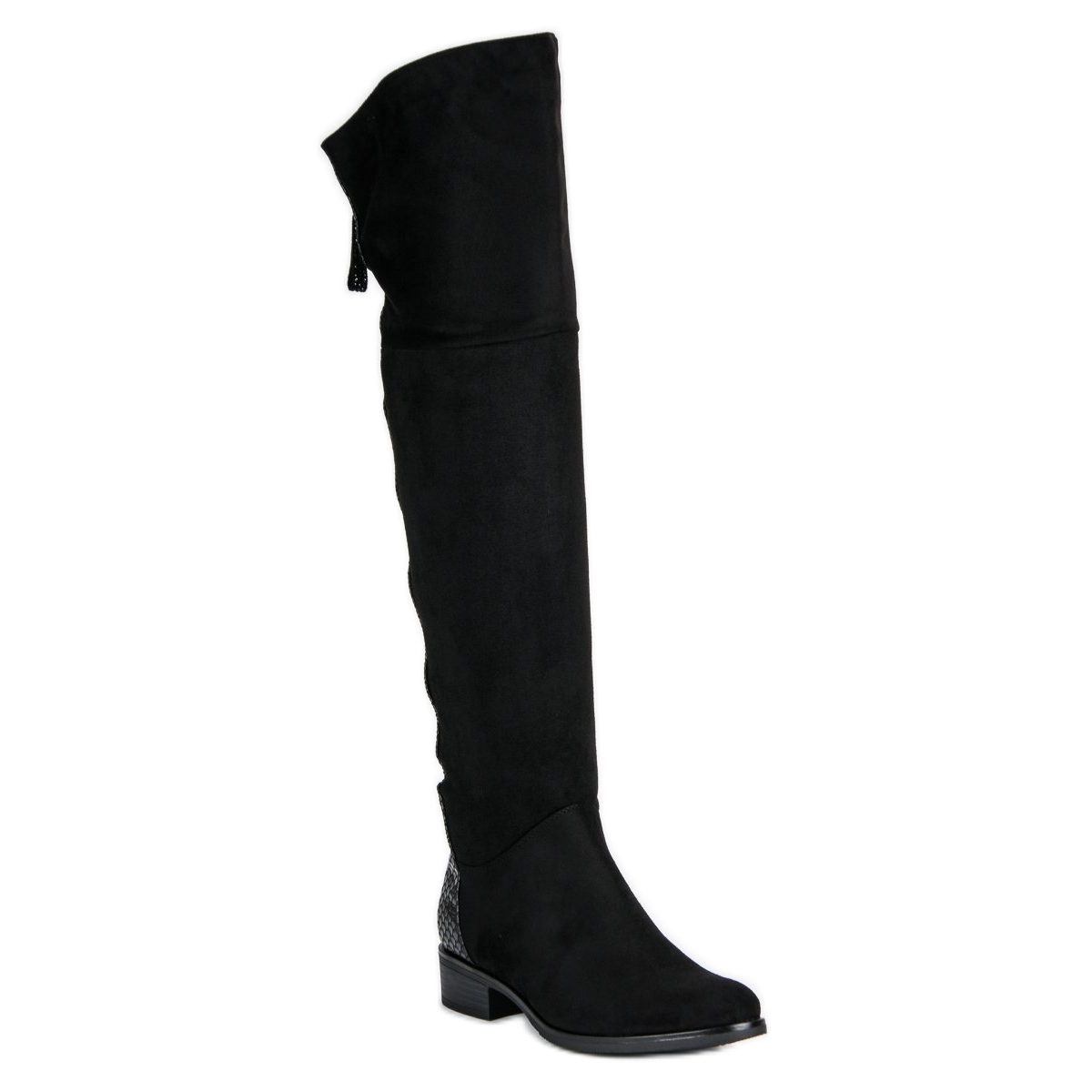 Boty vyrobené z ekologického semiše upoutají pozornost nejen svým vytříbeným vzhledem, ale také praktickou úpravou - hadí kůže jim dodává jedinečný charakter. Vysoký svršek sahající nad kolena skvěle tvaruje postavu a plochý podpatek zajistí pohodlí i při celonočních radovánkách.