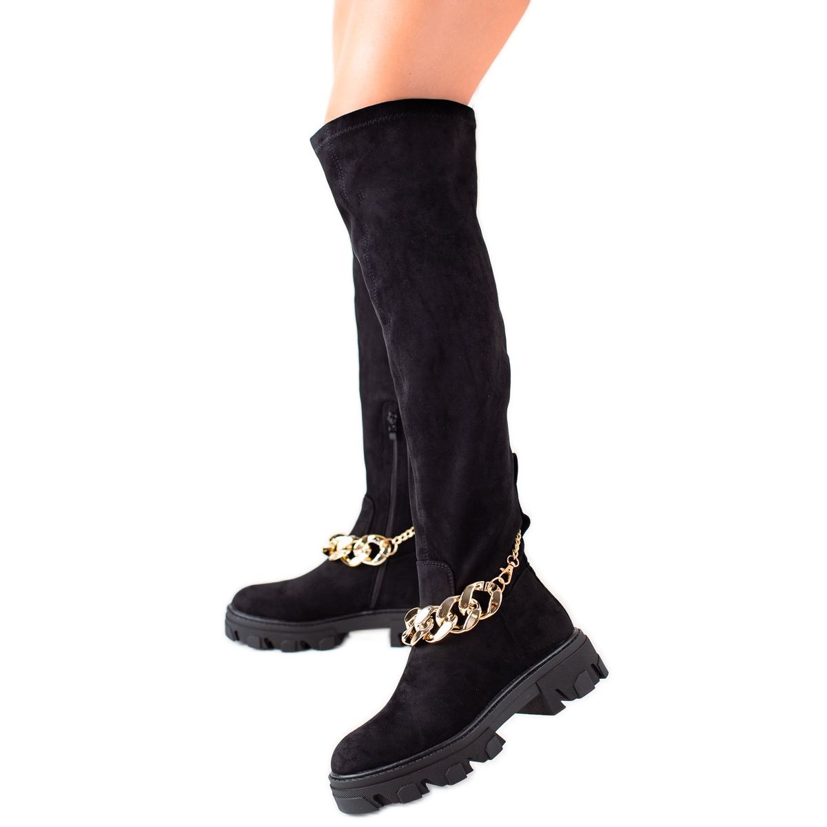 Podrobnosti: Diamantique Semišové kozačky se zlatým řetízkem černá