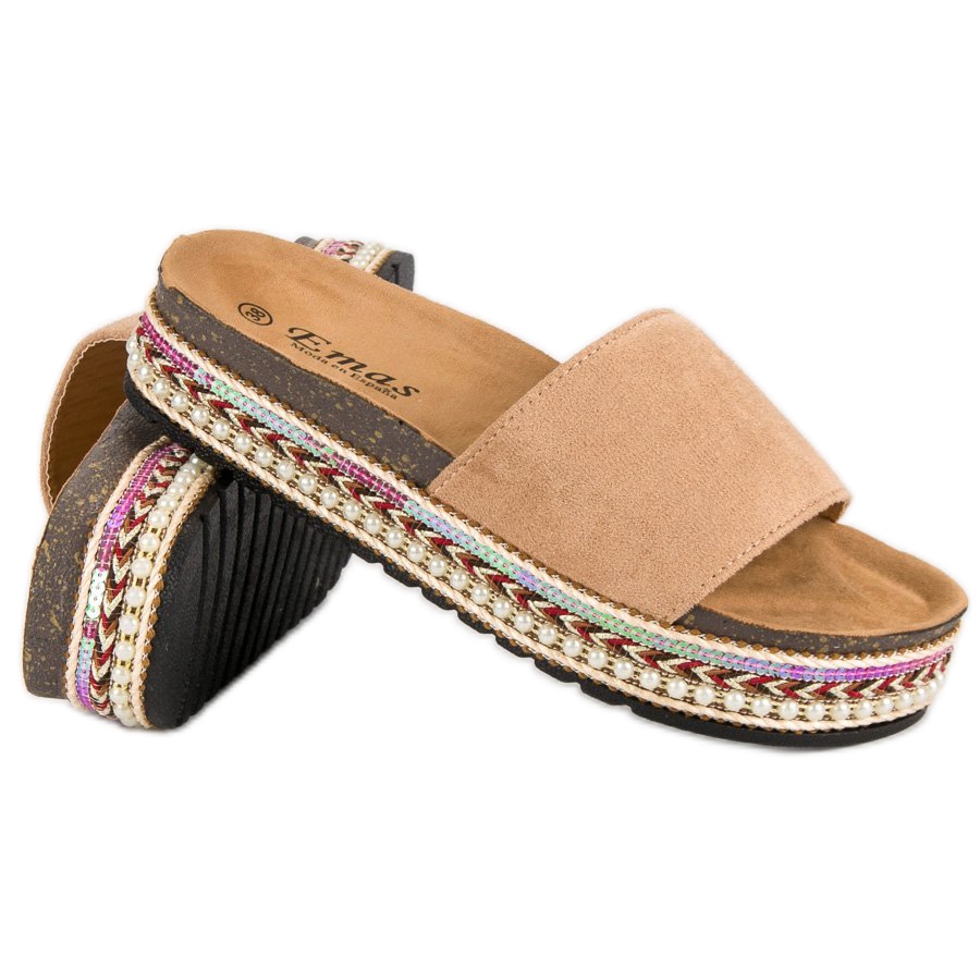 Žabky vyrobené z ekologické semišové kůže poskytují jemnost a luxusní vzhled. Díky teplému hnědému odstínu v kombinaci s béžovými detaily se perfektně hodí k nejrůznějším stylům – od ležérních až po elegantnější. Díky výšce podpatku 3 cm jsou ideální pro každou příležitost - bez ohledu na to, zda se chystáte na procházku, schůzku s přáteli nebo lenošené odpoledne na terase.