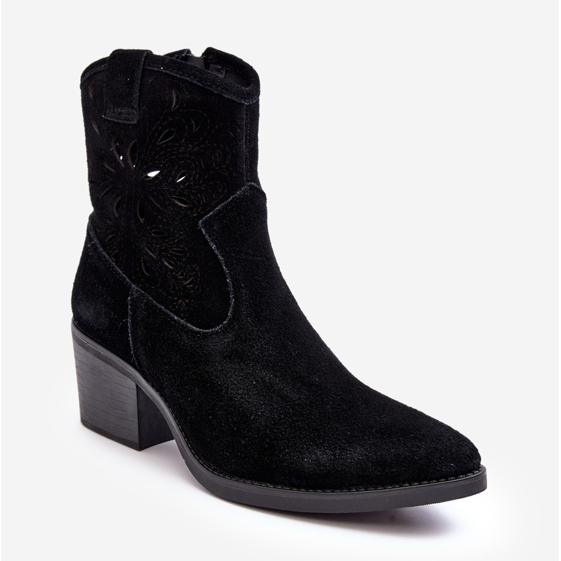 Elegantní ženské kovbojské boty vyrobené z přirozené semišové kůže, zdobené vzorem otevřeného díla po celém svršku. Model kombinuje ženský vzhled s pohodlným a stabilním patou jako sloupek (výška 6 cm). Připevněný jezdcem ze strany, s jasně protáhlým, špičkovým špičkou, která opticky štíhlá noha. Ideální pro jaro, léto a podzim - žádná izolace.