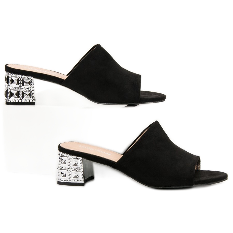 Objevte eleganci a pohodlí černých semišových mul na vysokém podpatku od Lucky Shoes. Tyto klasické dámské boty jsou dokonalou kombinací stylu a pohodlí, která jistě upoutá pozornost. Stříbrný, bohatě zdobený 5,5 cm vysoký podpatek jim dodává jedinečný charakter a dělá z nich módní akcent v mnoha ležérních i elegantních stylech.