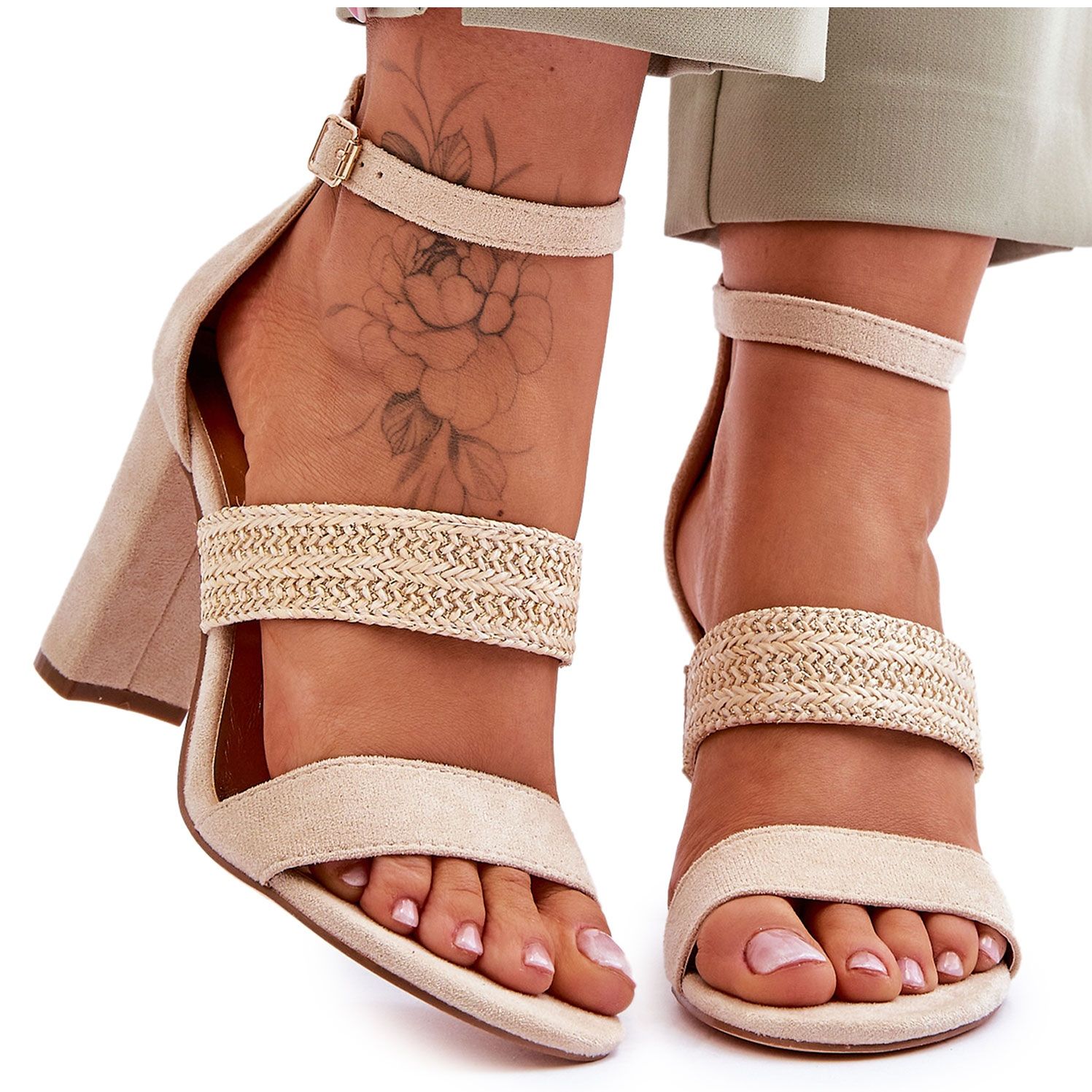 Semišové sandály Roselia jsou klasický, ženský model s 9 cm patou ve formě příspěvku. Vyrobeno z ekologického semiše v univerzálním béžovém odstínu (Beige). Na centrální části je jemný pletený popruh, zatímco v horní části je nastavitelný pás připevněn sponou. Měkká ekologická kožená vložka zajišťuje nošení pohodlí, pata je ztuhlá pro lepší stabilitu. Plastová podešve.