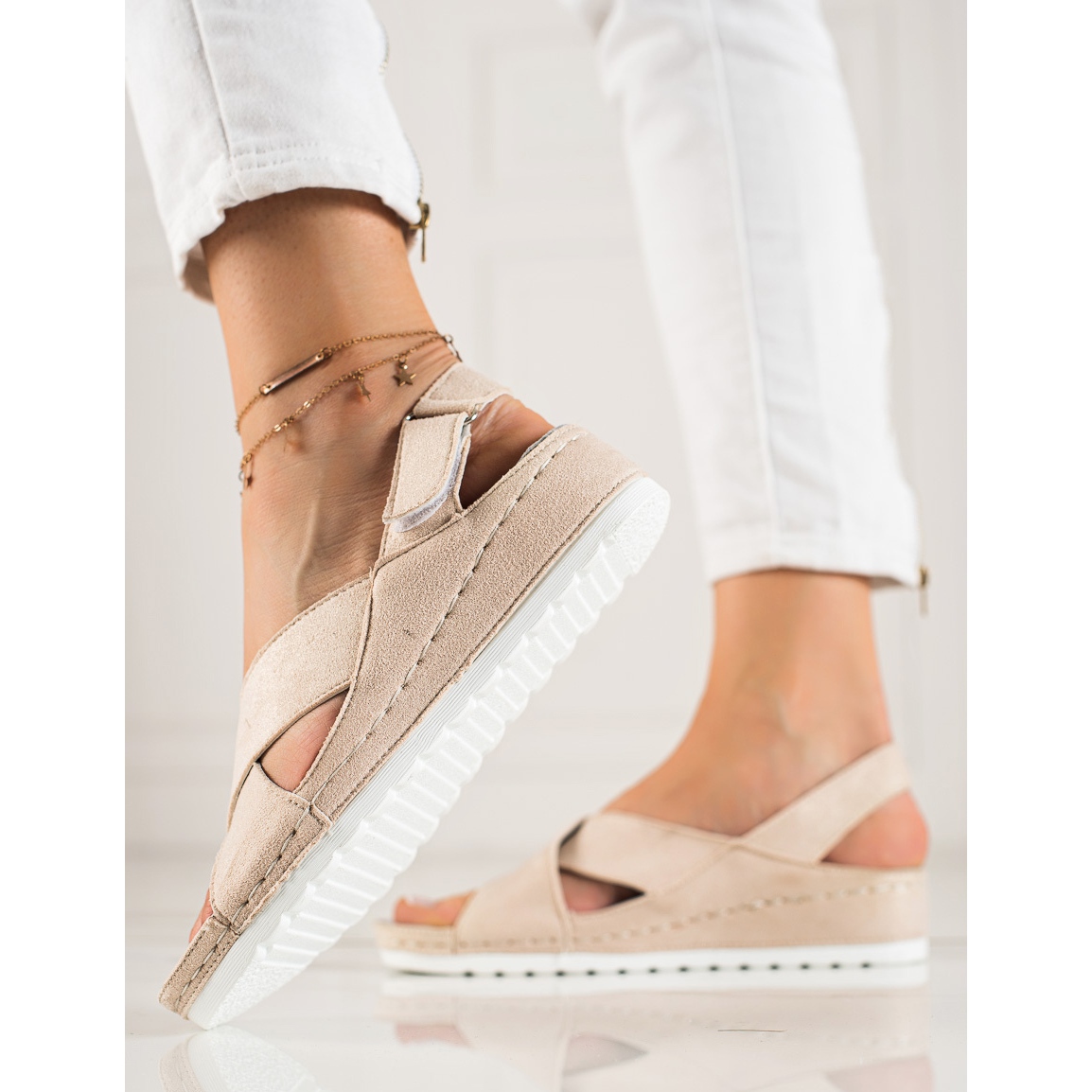 Boty jsou vyrobeny z vysoce kvalitních materiálů, vnější část obuvi je vyrobena z imitace semiše, což jim dodává elegantní vzhled, zatímco vnitřní část je vyrobena z přírodní kůže (50%) a textilu (50%) zaručující pohodlí při nošení. Díky pružnému pásku a páskům na suchý zip se sandály snadno přizpůsobí noze, což je klíčové pro každodenní používání.