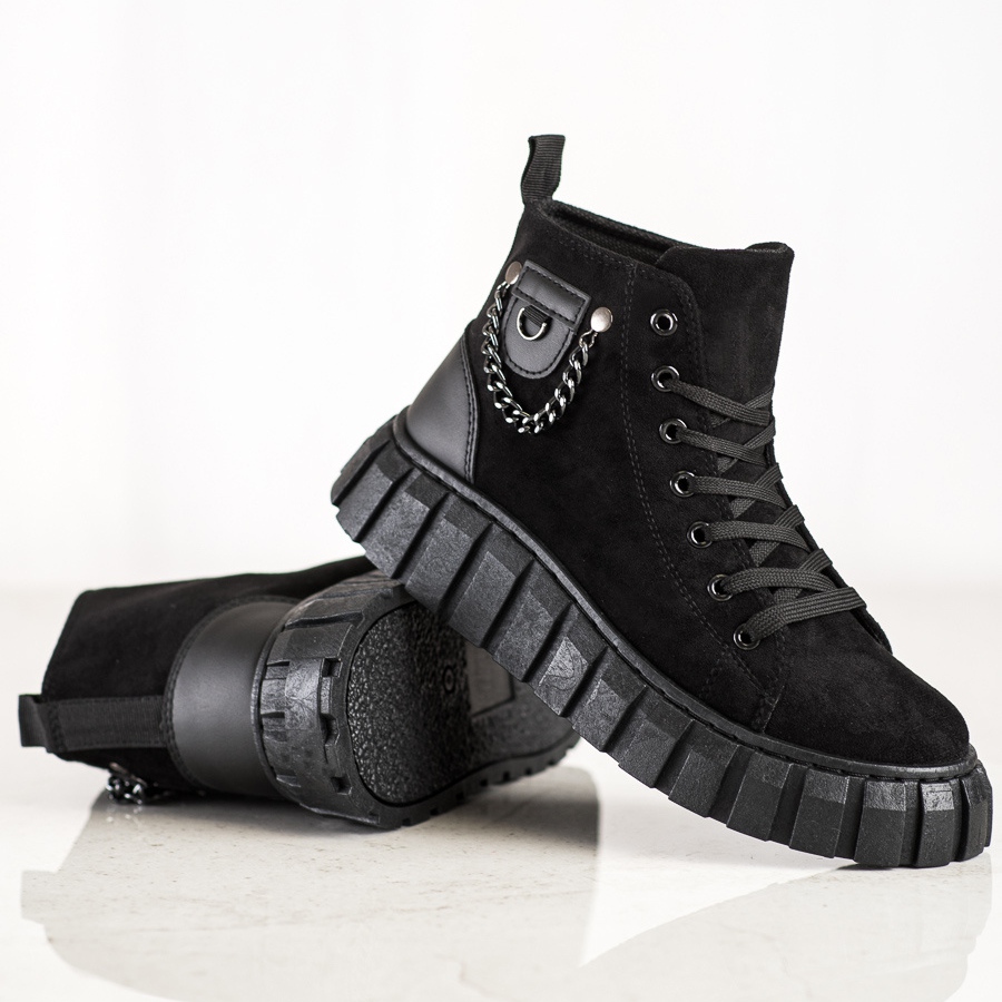Tyto boty vyrobené z ekologické semišové kůže kombinují eleganci s moderním designem. Ozdobný řetízek a kamínky jim dodávají jedinečný charakter, který odliší každý styl. Díky zabudované, měkké patě a kulaté špičce zajišťují tenisky komfort nošení po celý den.