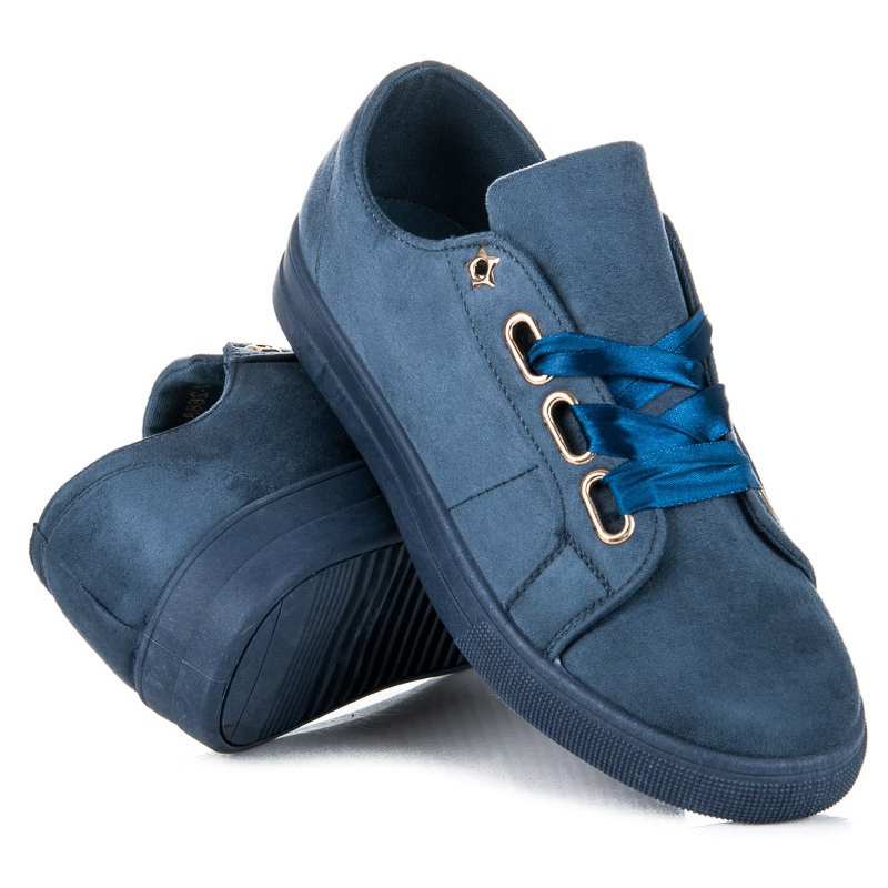 Ideální boty Semišové tenisky se stuhou - ženský, pohodlný a módní model pro každodenní použití. Modrý svršek se semišovou úpravou (ekokůže) kombinuje jemný styl se snadnou údržbou a ozdobná stuha místo tradičních tkaniček dodává celku jemný, módní charakter.