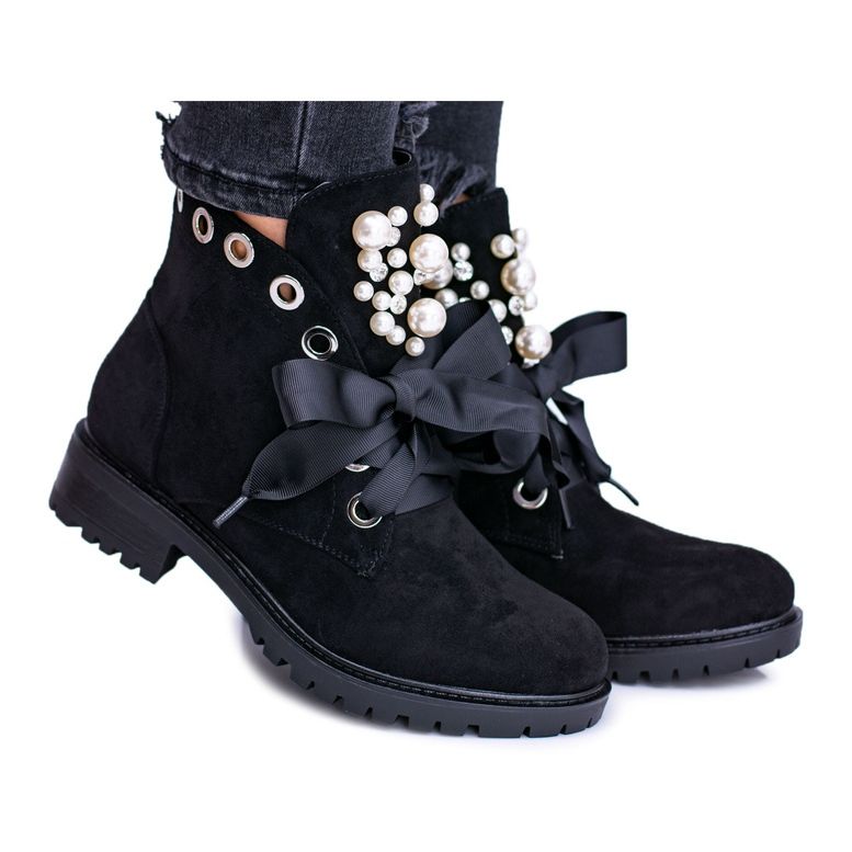 Semišové izolované boty s perlami a stuhou černá Perla je nutností v šatníku každé módní ženy, která si cení pohodlí, kvality a původního designu. Bez ohledu na příležitost tyto elegantní boty přidají styl jakémukoli stylu!
