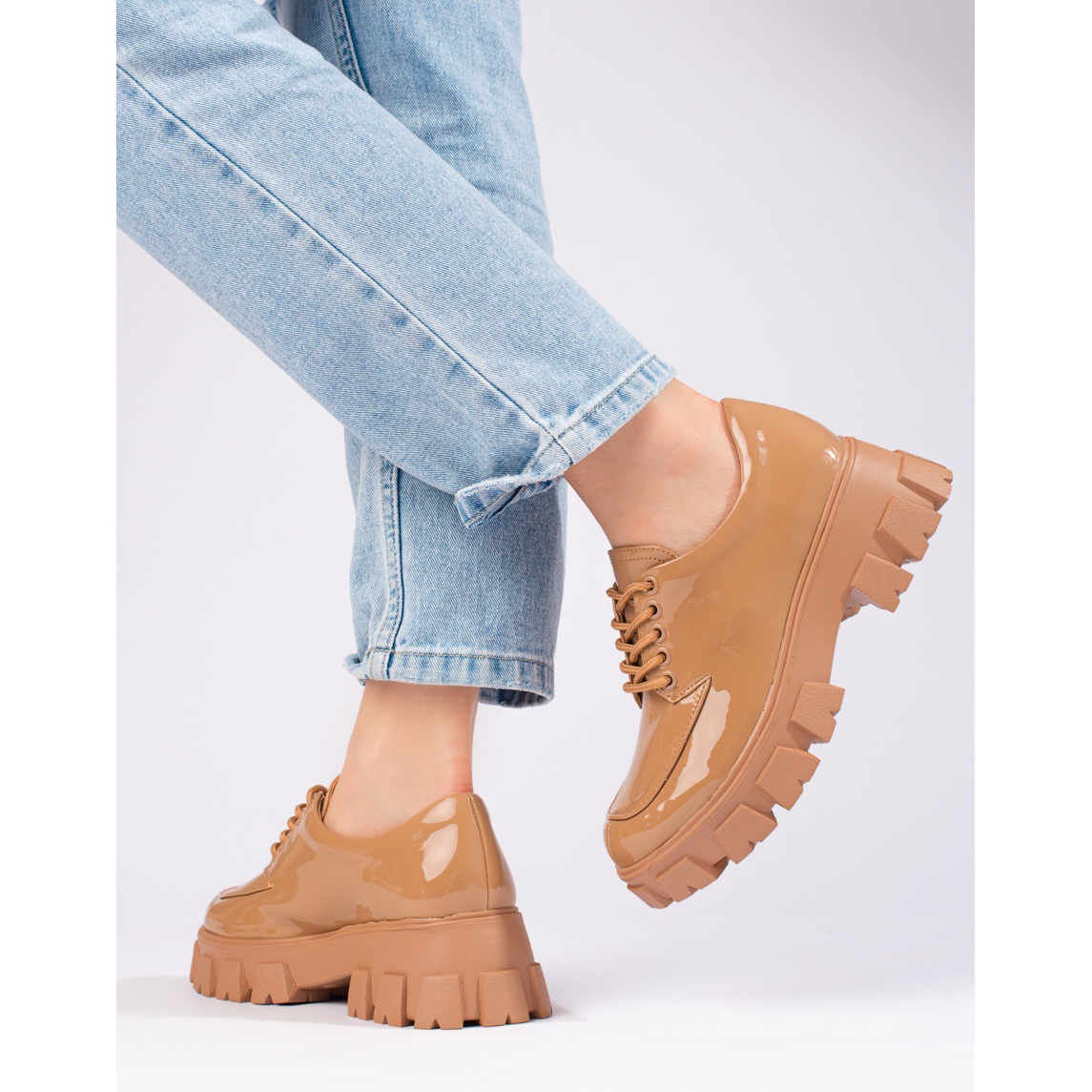 - Modelka: Lakované béžové boty na šněrování