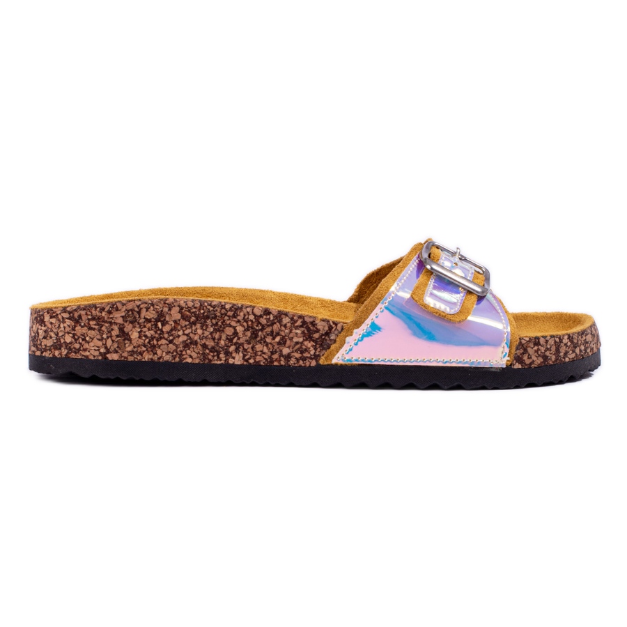 Holografické žluté korkové žabky Shelovet jsou perfektní volbou pro ženy, které každý den hledají kombinaci pohodlí a módního vzhledu. Tyto stylové žabky mají nazouvací zapínání a otevřenou patu, díky čemuž jsou mimořádně praktické a snadno se nazouvají. Vyrobeny z vysoce kvalitní ekologické semišové kůže, jsou dostupné v krásném holografickém odstínu žluté, který jistě upoutá pozornost a dodá lesk každému stylingu.