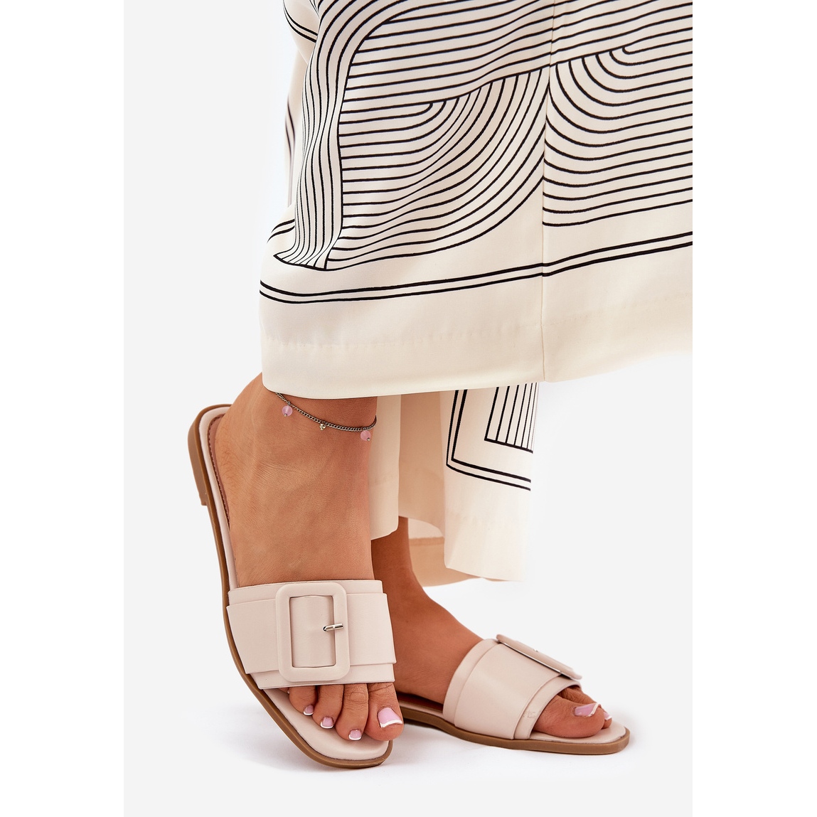 Charakteristický detail ve formě velké přezky v pásu přidává jemné kouzlo, díky čemuž jsou tyto překlopení módním přízvukem jakéhokoli stylu. Jsou ideální pro obě každodenní příležitostné sady i pro elegantnější oblečení, protože jejich jednoduchost zdůrazňuje přirozenou krásu každé ženy.