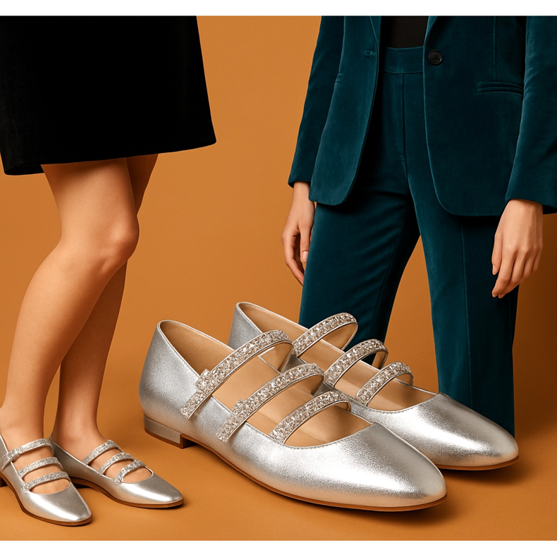 Zapomeňte na nudné černé balerínky, které nosíte do kanceláře. Na Silvestra musí ploché boty křičet: "Jsem připraven na párty!" Vybírejte modely zdobené krystaly, XXL mašlemi nebo vyrobené z metalické kůže. Stříbrné balerínky Mary Jane s mnoha ramínky jsou absolutním hitem letošní sezóny. Vypadají skvěle jak k malým černým šatům, tak k módnímu sametovému obleku.