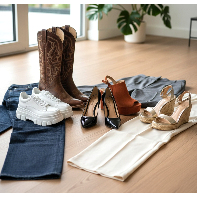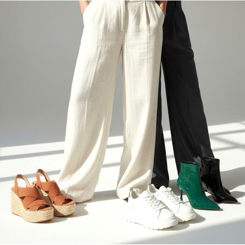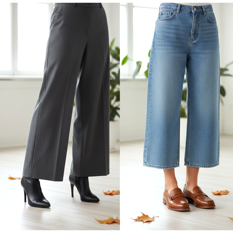 Mnoho žen si neuvědomuje, jak důležitou roli hraje délka nohy ve vztahu k výšce podpatku při nošení širokých nohavic. Nejjednodušší pravidlo: čím delší noha, tím vyšší podpatek je potřeba, aby netáhl po zemi a opticky nezkracoval postavu.