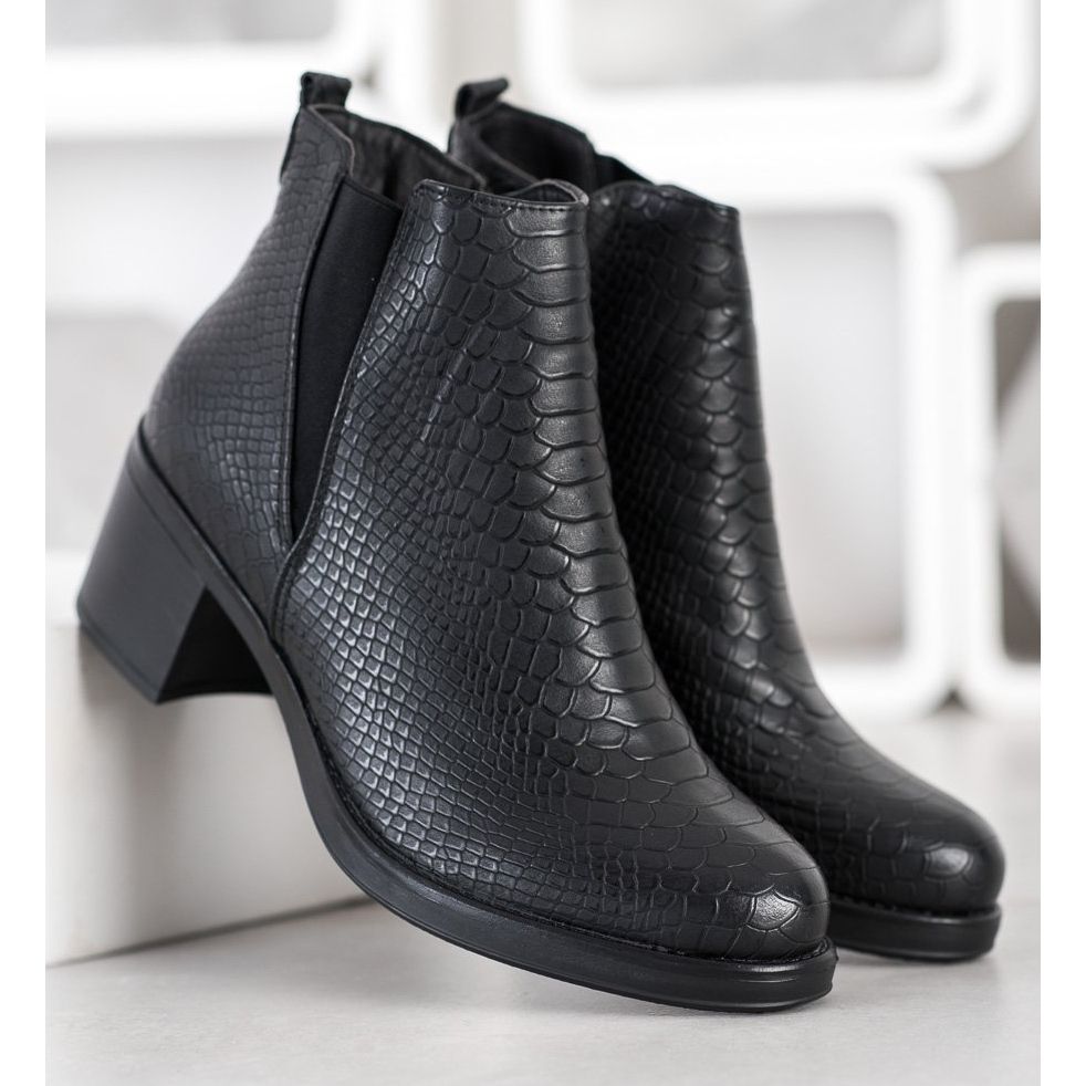 Objevte módní a elegantní kotníkové boty Sweet Shoes v černé barvě, které skvěle doplní váš podzimně-zimní šatník. Tyto jedinečné dámské kotníkové boty se vyznačují svrškem z vysoce kvalitní ekologické kůže, zdobeným reliéfním vzorem připomínajícím krokodýlí kůži.