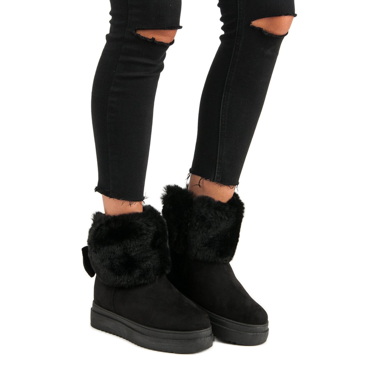 Černé sněhule vyrobené z ekologického semiše potěší nejen svým vzhledem, ale také kvalitou použitých materiálů. Hřejivý kožíšek, sahající až ke svršku, poskytuje teplo a pohodlí při poklesu venkovní teploty. Další výhodou jsou detaily jako ovčí kožich a stylová mašle, které botám dodávají jedinečný charakter.
