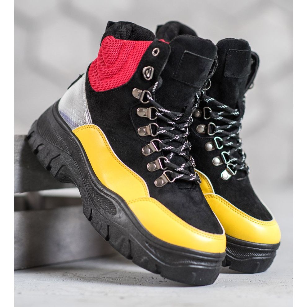 Objevte styl a pohodlí s barevnými kotníčkovými botami VICES, které se stanou perfektním doplňkem vašeho podzimně-zimního šatníku. Tyto šněrovací kozačky kombinují klasický střih s originálním designem, čímž se odlišují od ostatních modelů. Jejich jedinečná, vícebarevná paleta s černými, žlutými, červenými a stříbrnými akcenty přitahuje pozornost každého.